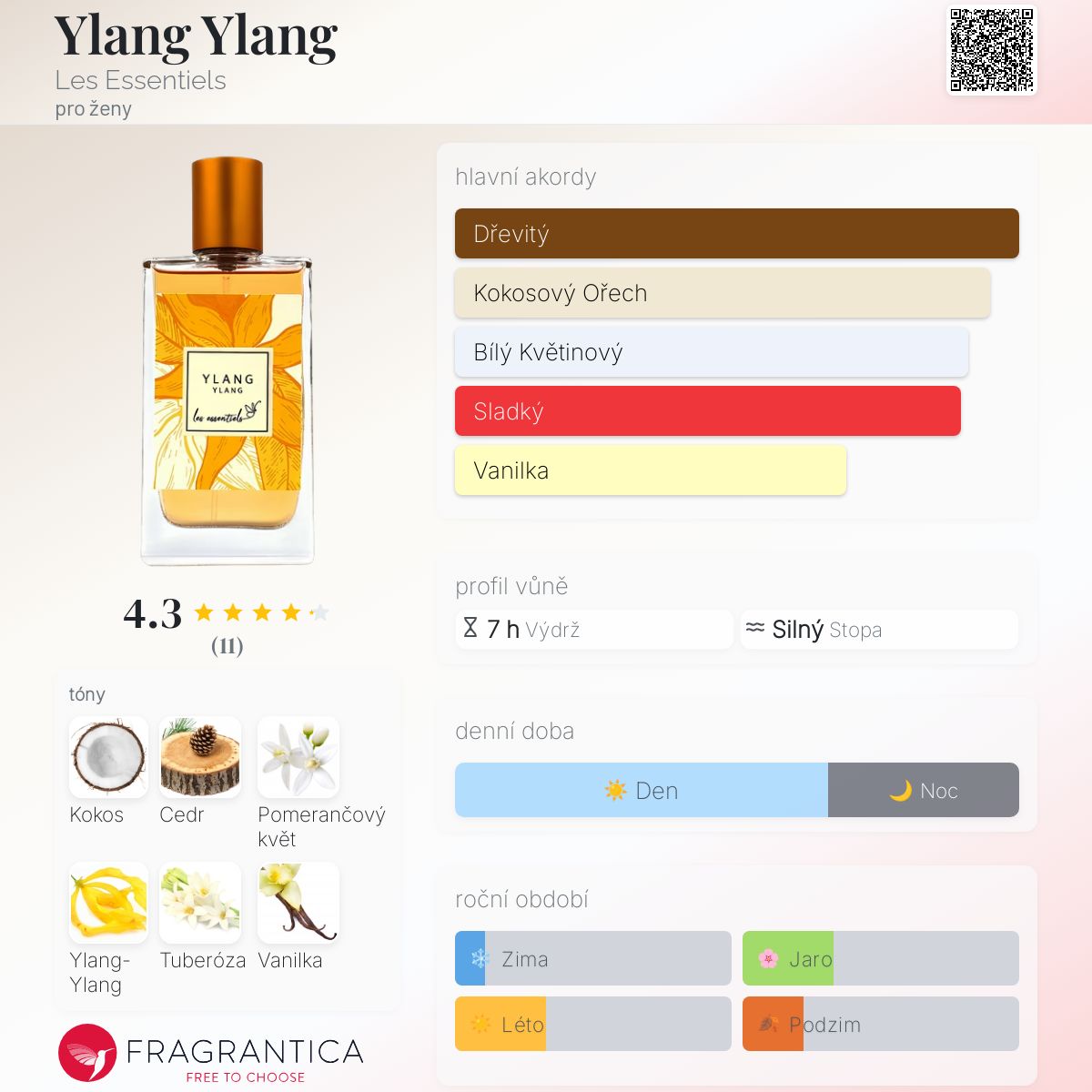 Ylang Ylang podle Les Essentiels je Floral Fruity vůně pro ženy. Vrchní tóny jsou Ylang-Ylang a Jasmín; střední tóny jsouKokos, Pomerančový květ a Tuberóza ; základní tóny jsou Cedr a Vanilka.