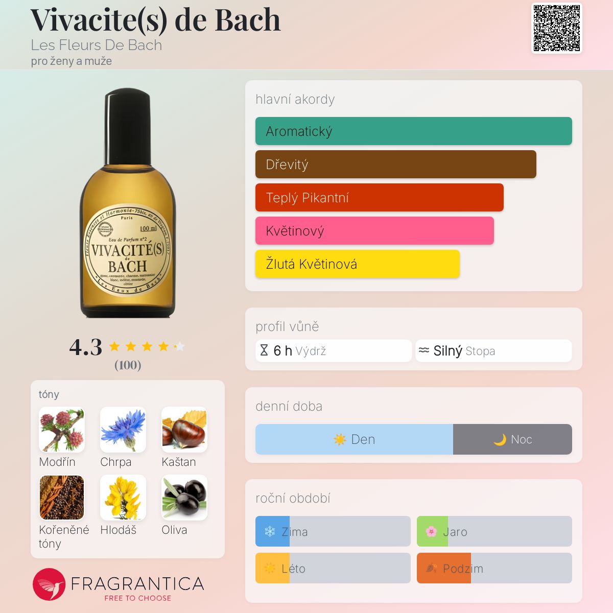 Vivacite(s) de Bach podle Les Fleurs De Bach je Woody Spicy vůně pro ženy a muže. Vrchní tóny jsou Semena chrpy a Hlodáš; střední tóny jsouKaštan a Oliva ; základní tóny jsou Modřín a Kořeněné tóny.