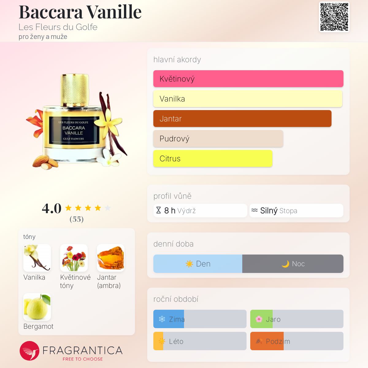 Baccara Vanille podle Les Fleurs du Golfe je Orientální Floral vůně pro ženy a muže. Baccara Vanille byl/a uveden/a v roce 2019. "Nosem" za touto vůní je Emna Doghri. Vrchní tón je Bergamot ; střední tón jeExotické květinové tóny ; základní tóny jsou Vanilka a Jantar (ambra).