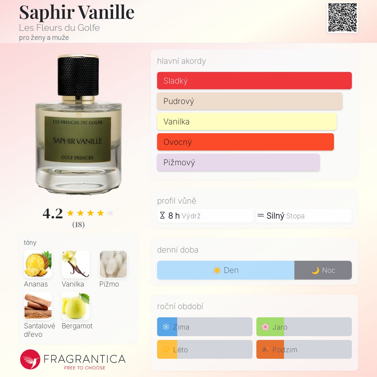 Saphir Vanille podle Les Fleurs du Golfe je Orientální Vanilla vůně pro ženy a muže. Saphir Vanille byl/a uveden/a v roce 2019. "Nosem" za touto vůní je Emna Doghri. Vrchní tóny jsou Ananas a Bergamot; střední tóny jsouVanilka a Bílé santalové dřevo ; základní tón je Pižmo.