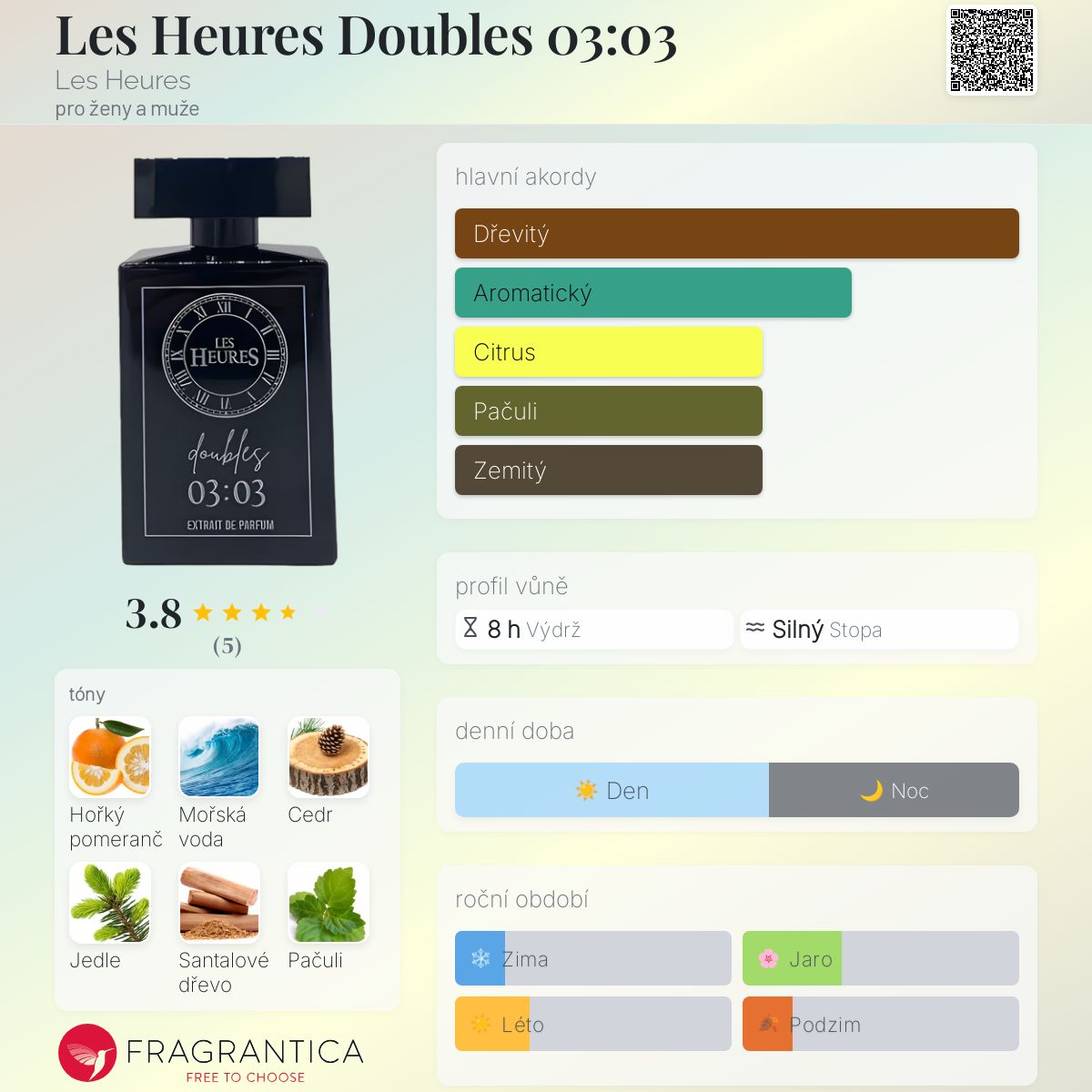 Les Heures Doubles 03:03 podle Les Heures je vůně pro ženy a muže. Toto je nová vůně. Les Heures Doubles 03:03 byl/a uveden/a v roce 2024. Vrchní tóny jsou Hořký pomeranč a Mořské tóny; střední tóny jsouCedr a Jedle ; základní tóny jsou Pačuli, Santalové dřevo a Vetiver.