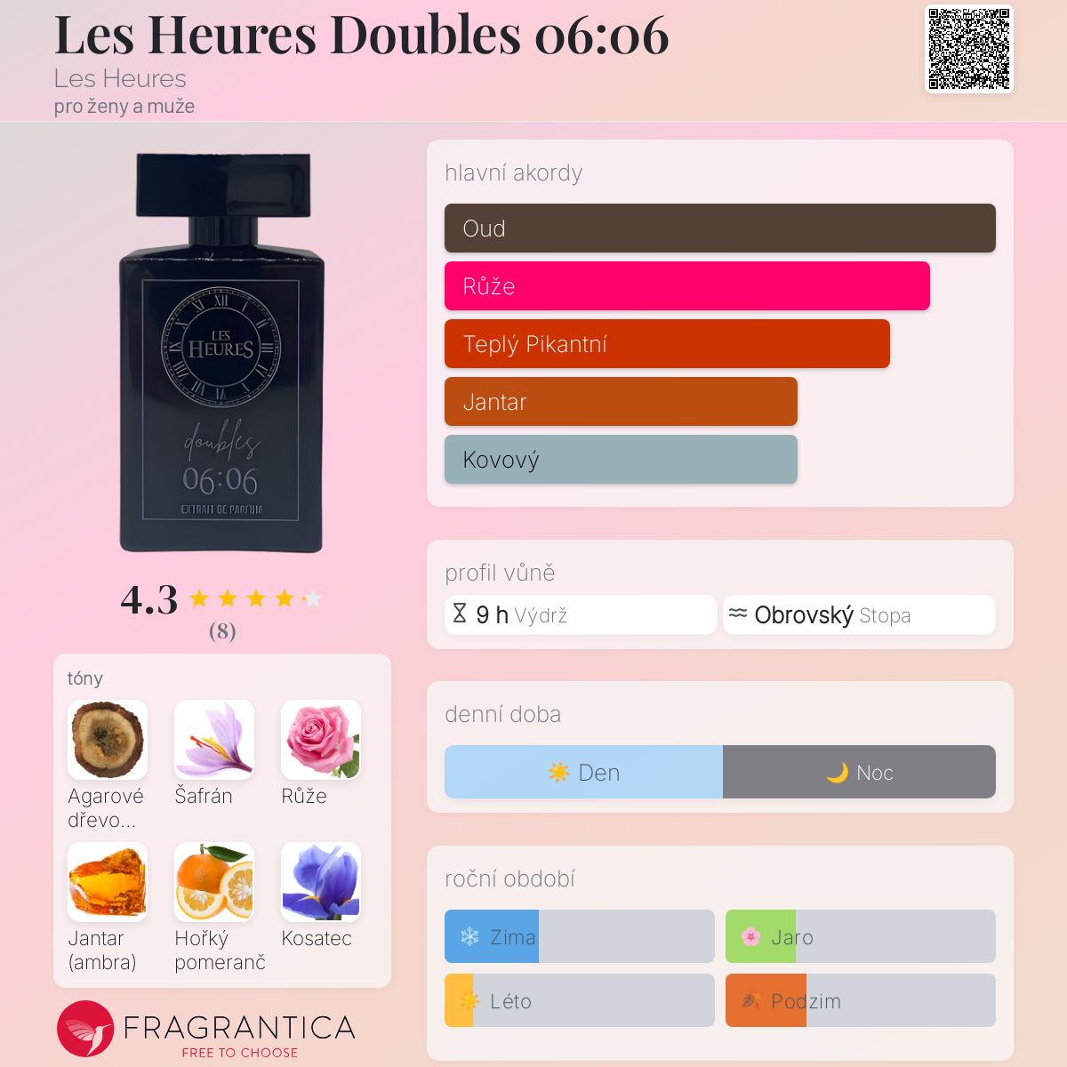 Les Heures Doubles 06:06 podle Les Heures je vůně pro ženy a muže. Toto je nová vůně. Les Heures Doubles 06:06 byl/a uveden/a v roce 2024. Vrchní tóny jsou Šafrán a Hořký pomeranč; střední tóny jsouRůže a Kosatec ; základní tóny jsou Agarové dřevo (oud) a Jantar (ambra).