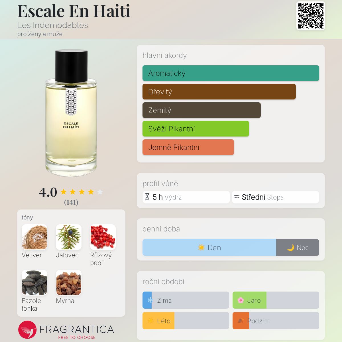 Escale En Haiti podle Les Indemodables je Woody Aromatic vůně pro ženy a muže. Escale En Haiti byl/a uveden/a v roce 2020.