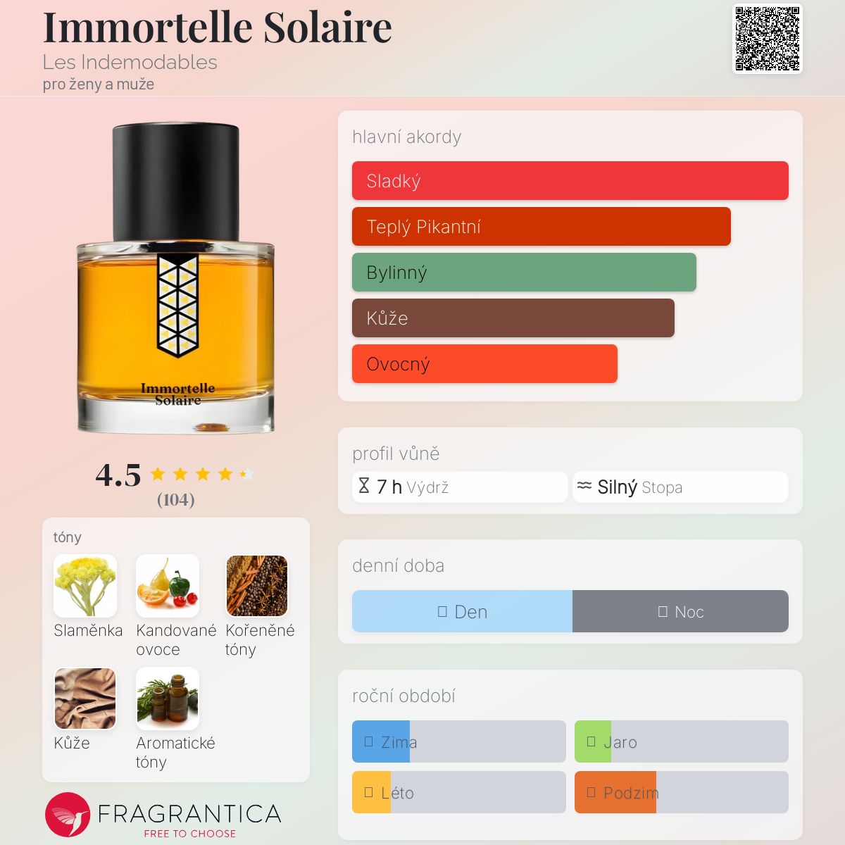 Immortelle Solaire podle Les Indemodables je vůně pro ženy a muže. Toto je nová vůně. Immortelle Solaire byl/a uveden/a v roce 2025. "Nosem" za touto vůní je Antoine Lie.