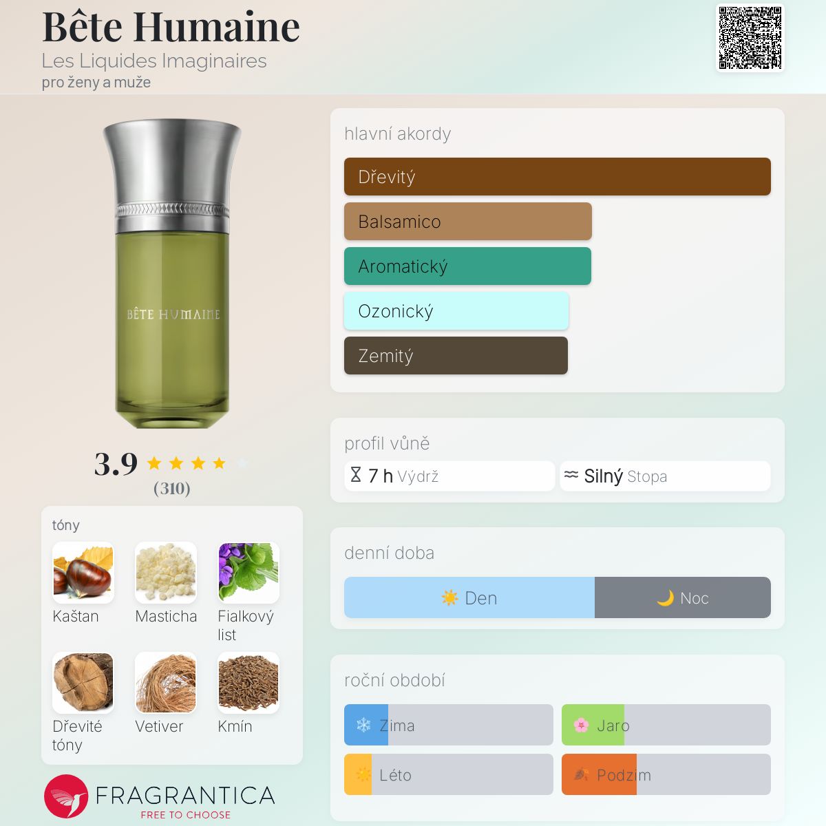 Bête Humaine podle Les Liquides Imaginaires je Woody Aromatic vůně pro ženy a muže. Bête Humaine byl/a uveden/a v roce 2021. "Nosem" za touto vůní je Amelie Bourgeois. Vrchní tóny jsou Kaštan, Masticha, Fialkový list a Římský kmín; střední tóny jsouDřevité tóny, Santalové dřevo, Labdanum a Virginský cedr ; základní tóny jsou Haitský vetiver, Cypriolový olej, Papyrus, Guajakové dřevo a Borovice.