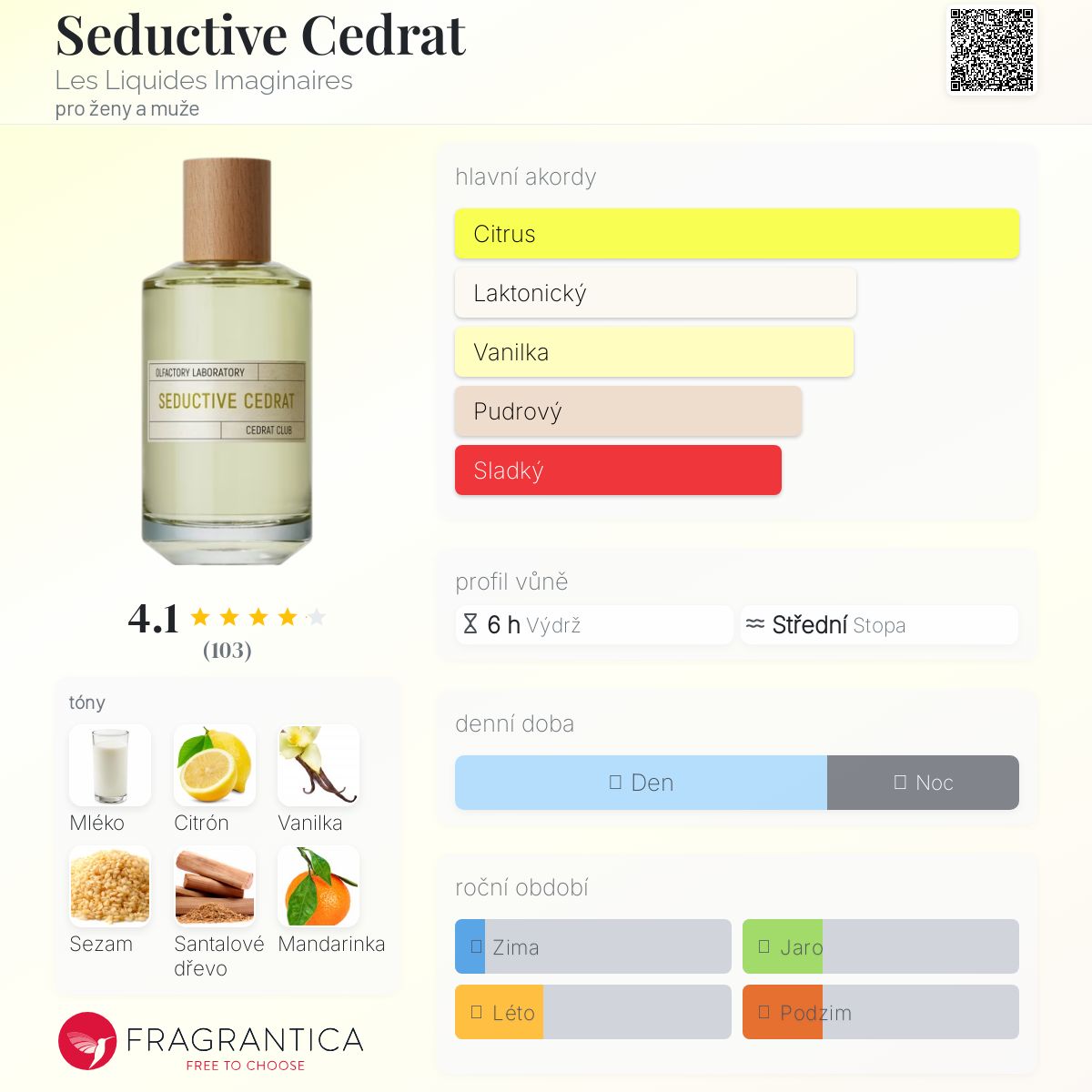Seductive Cedrat podle Les Liquides Imaginaires je Citrus Gourmand vůně pro ženy a muže. Toto je nová vůně. Seductive Cedrat byl/a uveden/a v roce 2025. "Nosem" za touto vůní je Andrea Montanari. Vrchní tóny jsou Citrón, Zelená mandarinka, Yuzu a Růžový pepř; střední tóny jsouMléko, Sezam, Jasmín a Zelené tóny ; základní tóny jsou Vanilka, Santalové dřevo, Jantar (ambra), Pižmo a Cedr.