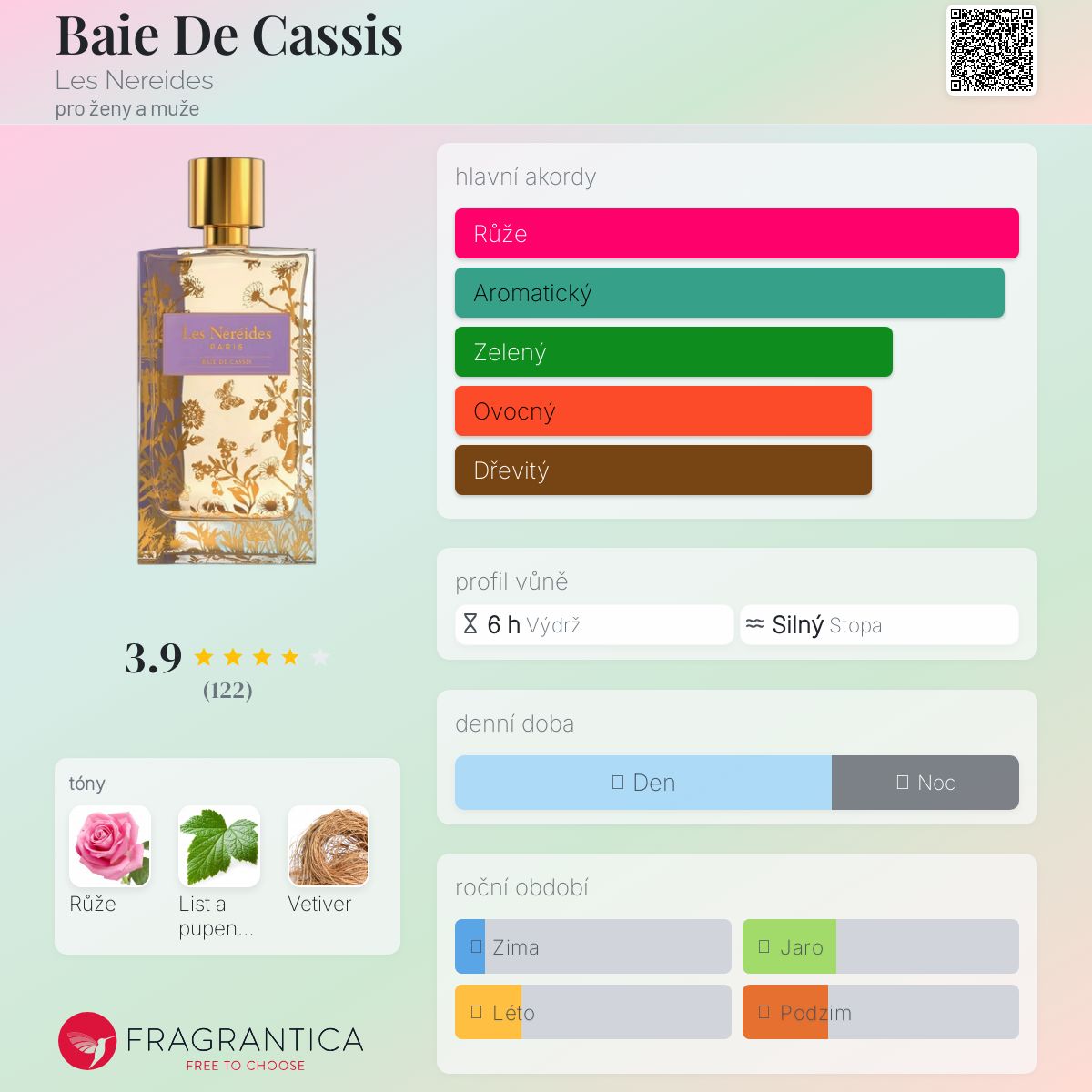Baie De Cassis podle Les Nereides je vůně pro ženy a muže. Baie De Cassis byl/a uveden/a v roce 2020. Vrchní tón je Černý rybíz ; střední tón jeRůže ; základní tón je Vetiver.