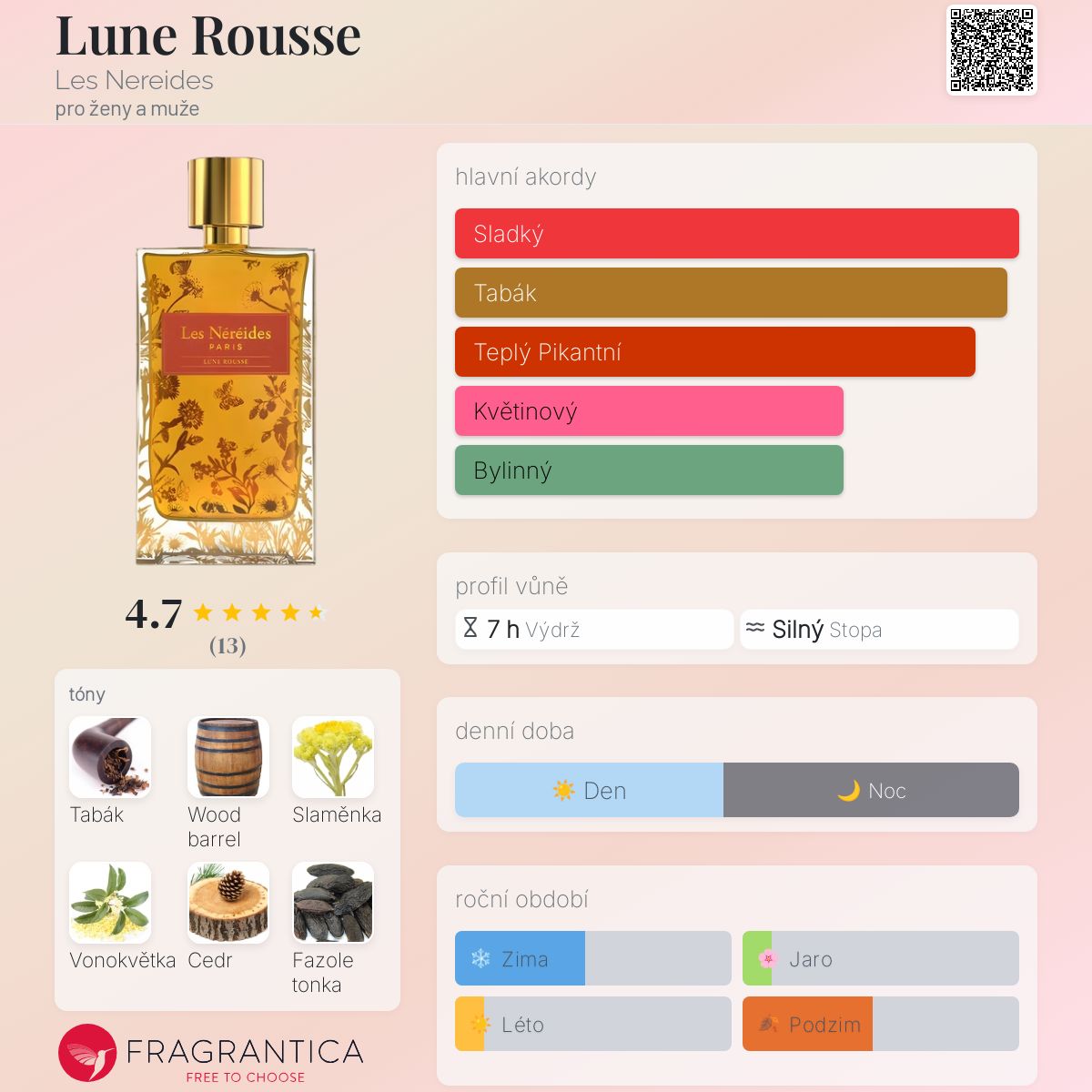 Lune Rousse podle Les Nereides je Orientální Woody vůně pro ženy a muže. Toto je nová vůně. Lune Rousse byl/a uveden/a v roce 2025. Vrchní tóny jsou Tabákový list, Kakao a Šafrán; střední tóny jsouVonokvětka, Cedr a Růže ; základní tóny jsou Dřevěný sud, Slaměnka, Fazole tonka a Pižmo.