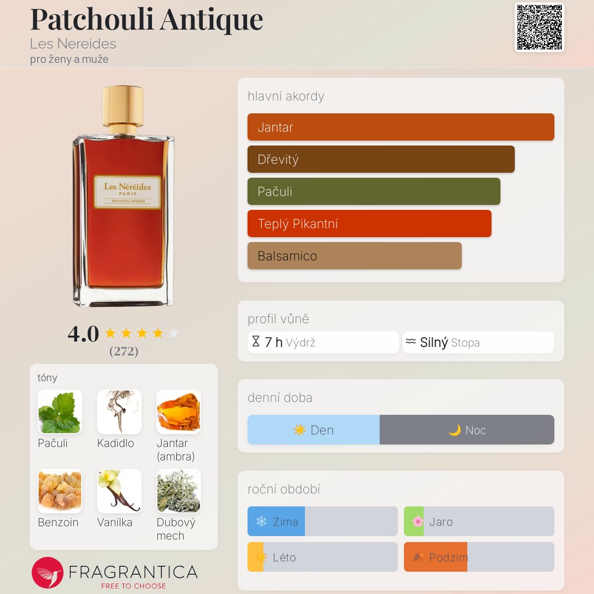 Patchouli Antique podle Les Nereides je Orientální Woody vůně pro ženy a muže. Patchouli Antique byl/a uveden/a v roce 2019. Vrchní tón je Kadidlo ; střední tóny jsouPačuli a Texaský cedr ; základní tóny jsou Jantar (ambra), Benzoin, Vanilka a Dubový mech.