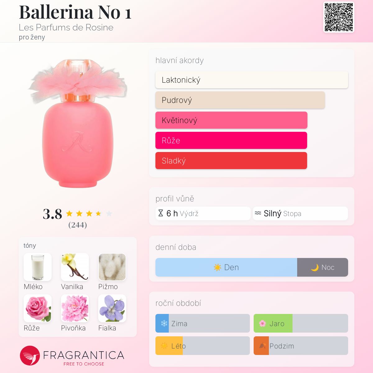 Ballerina No 1 podle Les Parfums de Rosine je Floral vůně pro ženy. Ballerina No 1 byl/a uveden/a v roce 2014. Vrchní tóny jsou Broskev, Hruška, Frézie a Bergamot; střední tóny jsouRůže, Pivoňka, Fialka a Maliny ; základní tóny jsou Mléko, Vanilka, Pižmo a Santalové dřevo.