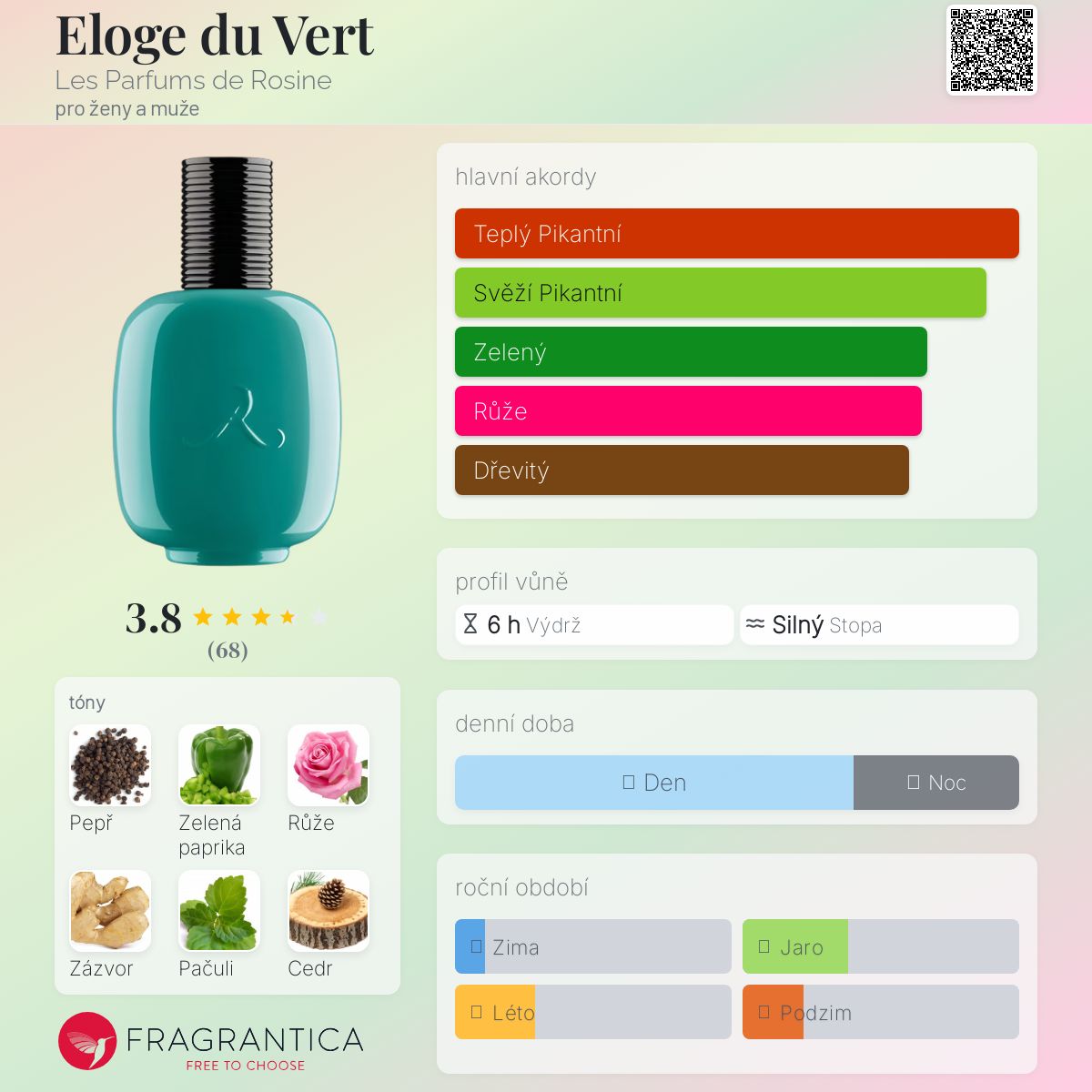 Eloge du Vert podle Les Parfums de Rosine je Woody Spicy vůně pro ženy a muže. Eloge du Vert byl/a uveden/a v roce 2019. "Nosem" za touto vůní je Delphine Lebeau. Vrchní tóny jsou Zelená paprika a Růže; střední tóny jsouPepř a Zázvor ; základní tóny jsou Pačuli a Cedr.