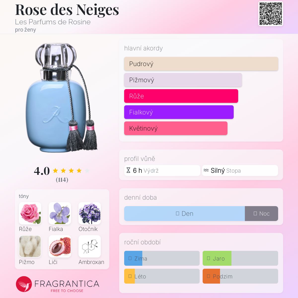 Rose des Neiges podle Les Parfums de Rosine je Floral Fruity vůně pro ženy. Rose des Neiges byl/a uveden/a v roce 2016. Vrchní tóny jsou Liči, Mandarinka, Vodní meloun a Růžový pepř; střední tóny jsouRůže a Bílá fialka ; základní tóny jsou Otočník, Pižmo, Ambroxan a Santalové dřevo.