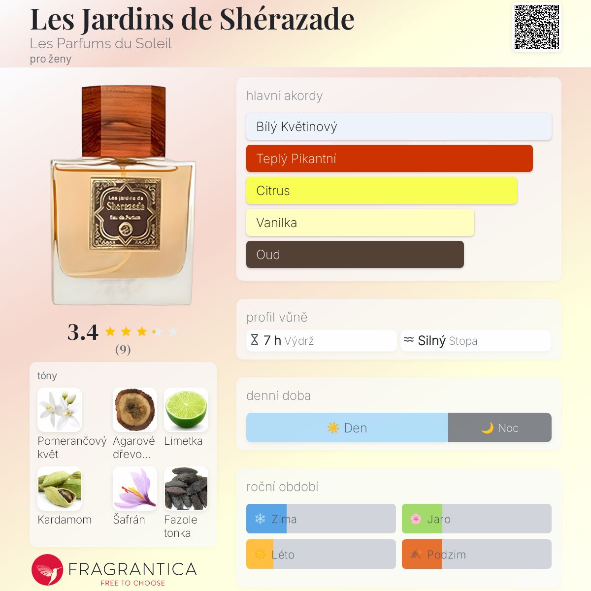 Les Jardins de Shérazade podle Les Parfums du Soleil je Orientální Floral vůně pro ženy. "Nosem" za touto vůní je Abderrazzak Benchaâbane. Vrchní tóny jsou Pomerančový květ, Limetka a Kardamom; střední tóny jsouŠafrán, Jasmín a Růže ; základní tóny jsou Agarové dřevo (oud), Fazole tonka, Vanilka, Santalové dřevo a Pačuli.