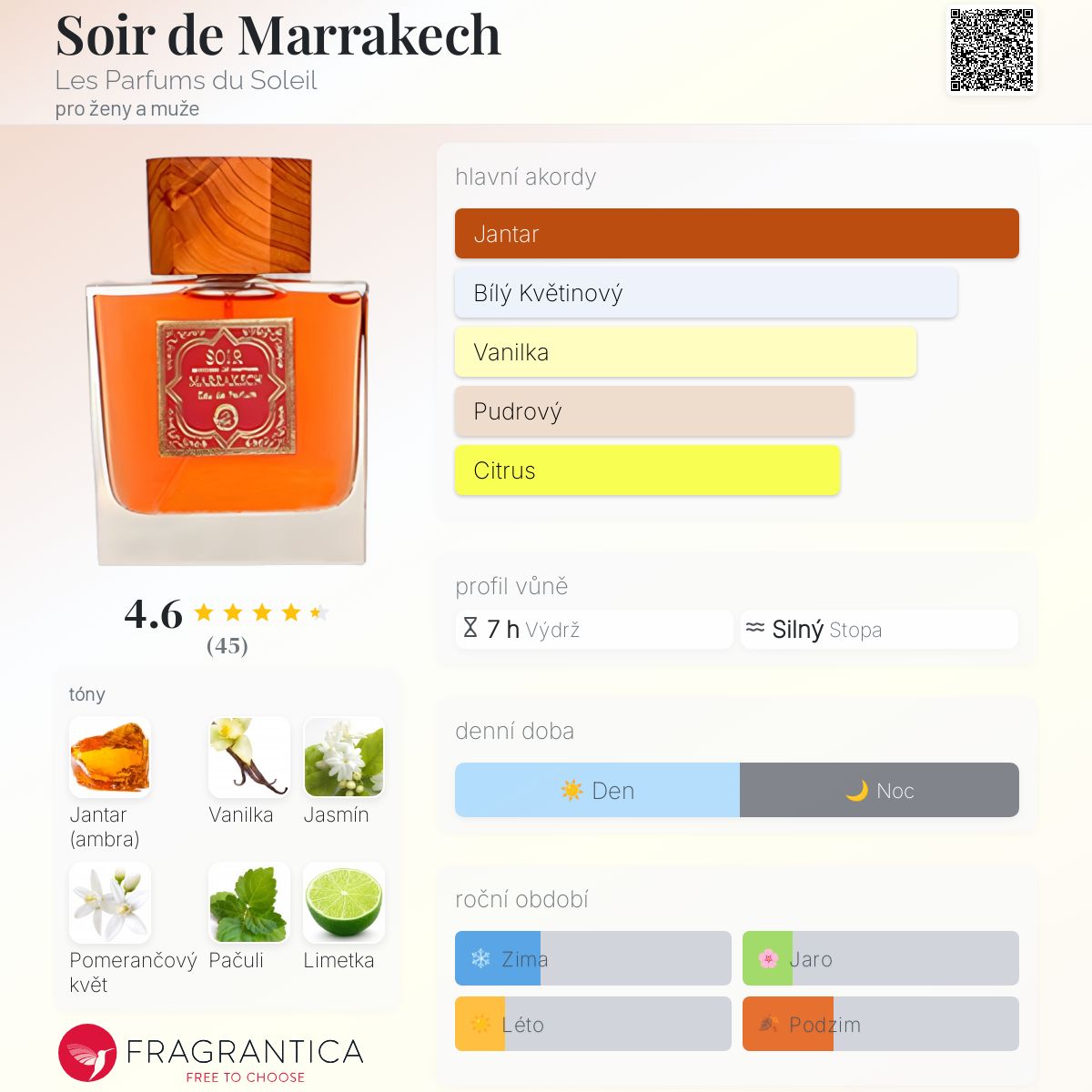 Soir de Marrakech podle Les Parfums du Soleil je Orientální Floral vůně pro ženy a muže. Soir de Marrakech byl/a uveden/a v roce 2004. "Nosem" za touto vůní je Abderrazzak Benchaâbane. Vrchní tóny jsou Pomerančový květ a Limetka; střední tón jeJasmín ; základní tóny jsou Jantar (ambra), Vanilka, Pačuli, Santalové dřevo a Pižmo.