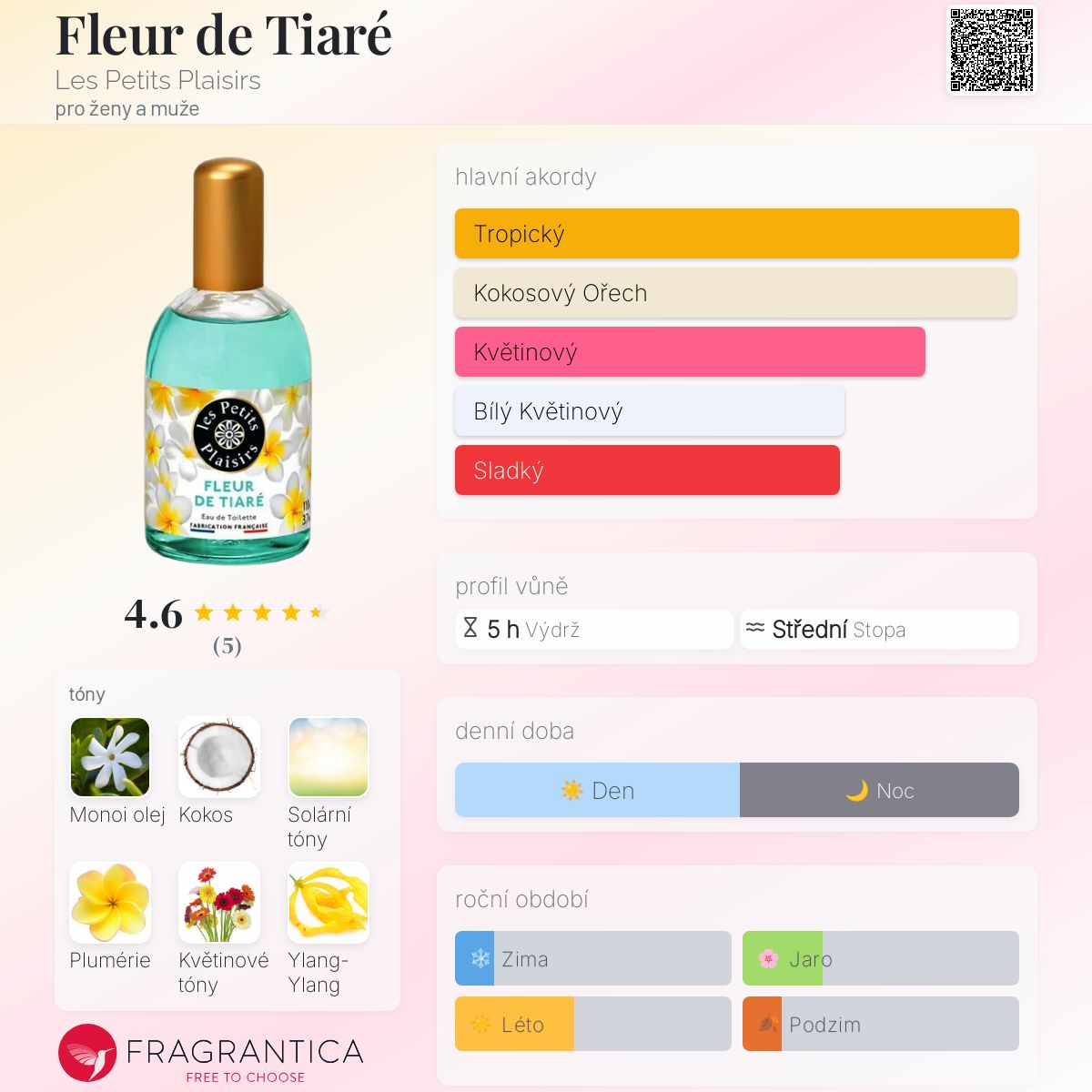 Fleur de Tiaré podle Les Petits Plaisirs je Orientální Floral vůně pro ženy a muže. Fleur de Tiaré byl/a uveden/a v roce 2024. Vrchní tóny jsou Solární tóny a Pomeranč; střední tóny jsouPlumérie, Květiny a Ylang-Ylang ; základní tóny jsou Monoi olej, Kokos a Jantar (ambra).