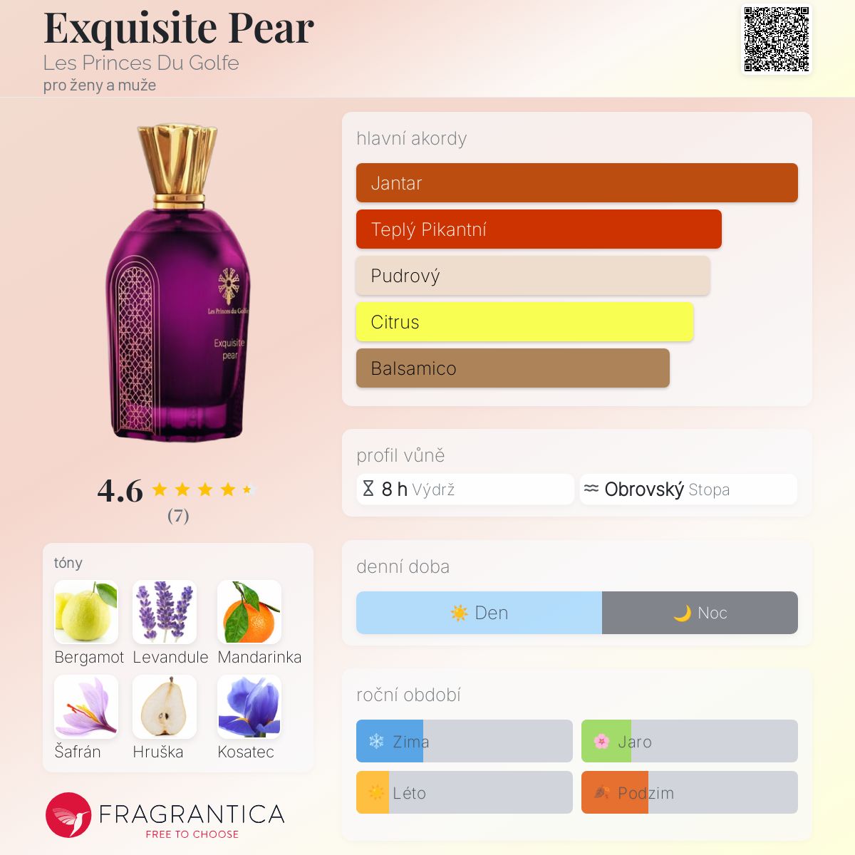 Exquisite Pear podle Les Princes Du Golfe je Orientální Vanilla vůně pro ženy a muže. Toto je nová vůně. Exquisite Pear byl/a uveden/a v roce 2025. "Nosem" za touto vůní je Chris Maurice. Vrchní tóny jsou Bergamot, Levandule, Mandarinka, Šafrán, Hruška a Kosatec; střední tóny jsouAmbra, Kadidlo, Fialka a Myrha ; základní tóny jsou Fazole tonka, Pačuli, Vanilka a Pižmo.