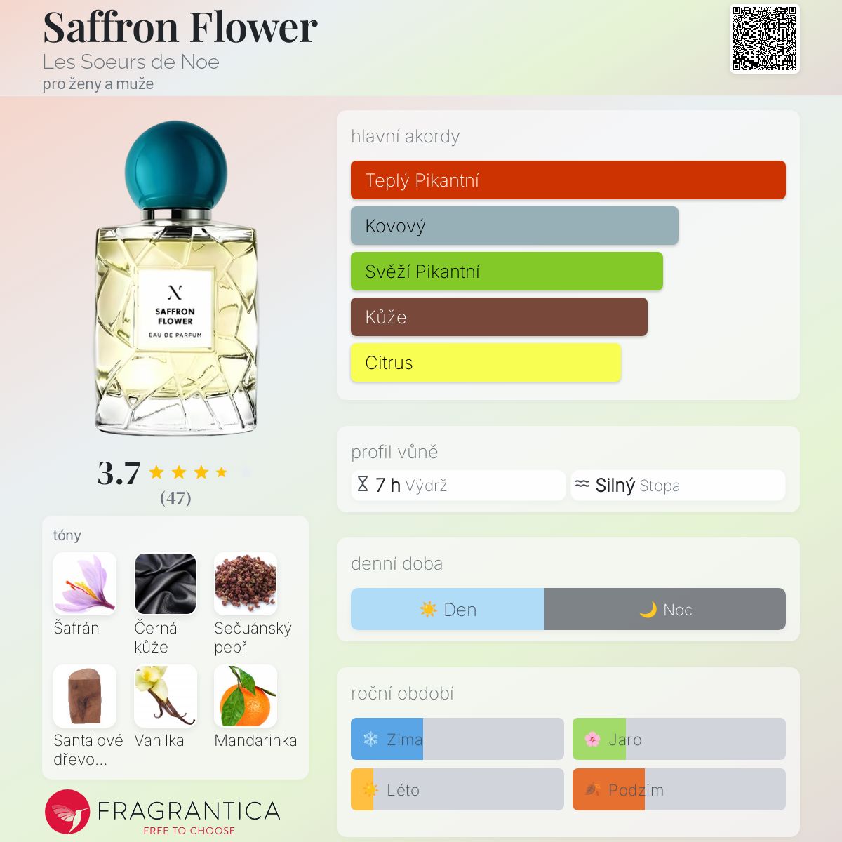 Saffron Flower podle Les Soeurs de Noe je Orientální Floral vůně pro ženy a muže. Saffron Flower byl/a uveden/a v roce 2022. Saffron Flower byl/a vytvořen/a Jérôme Epinette a Pierre Wulff. Vrchní tóny jsou Sečuánský pepř a Mandarinka; střední tóny jsouŠafrán a Divoký jasmín ; základní tóny jsou Černá kůže, Santalové dřevo Mysore a Vanilka.