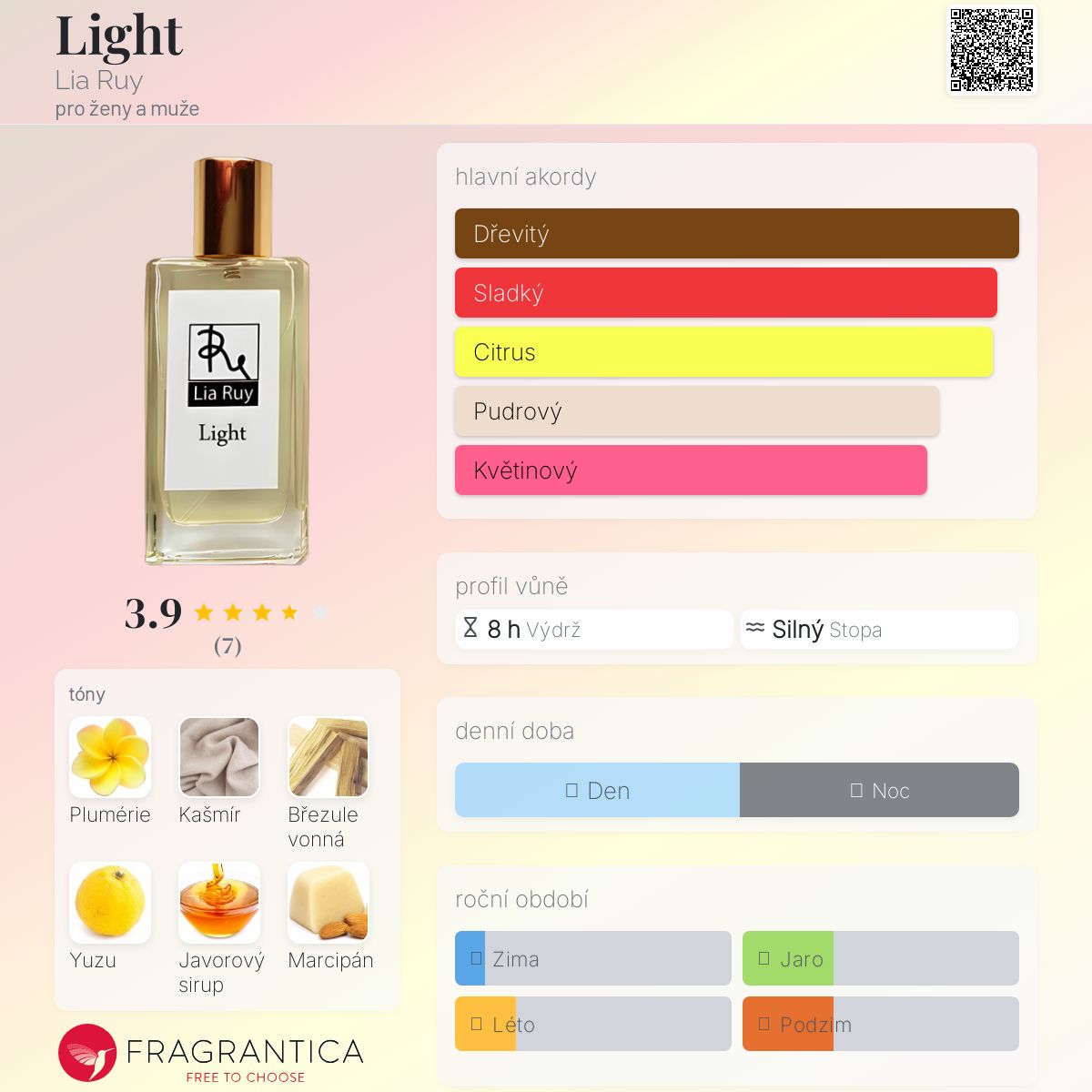 Light podle Lia Ruy je Floral Aquatic vůně pro ženy a muže. Light byl/a uveden/a v roce 2021. "Nosem" za touto vůní je Julia Kupriyanova. Vrchní tóny jsou Mandarinka, Neroli a Šampaňské; střední tóny jsouPlumérie, Yuzu, Mimóza a Ylang-Ylang ; základní tóny jsou Kašmír, Březule vonná, Javorová míza, Marcipán, Balzám Tolu, Atlasový cedr a Vanilka.