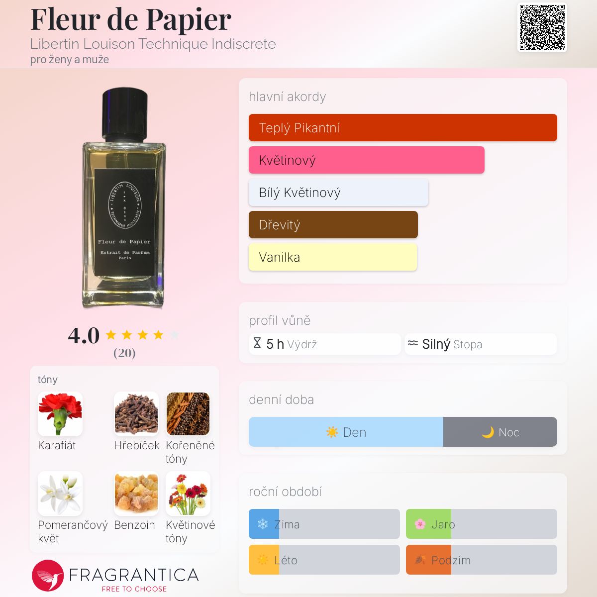 Fleur de Papier podle Libertin Louison Technique Indiscrete je Floral vůně pro ženy a muže. Fleur de Papier byl/a uveden/a v roce 2017. "Nosem" za touto vůní je Libertin Louison. Vrchní tóny jsou Pomerančový květ a Květinové tóny; střední tóny jsouKarafiát, Hřebíček, Koření, Růže a Jasmín ; základní tóny jsou Benzoin, Vanilka, Dřevité tóny a Cedr.