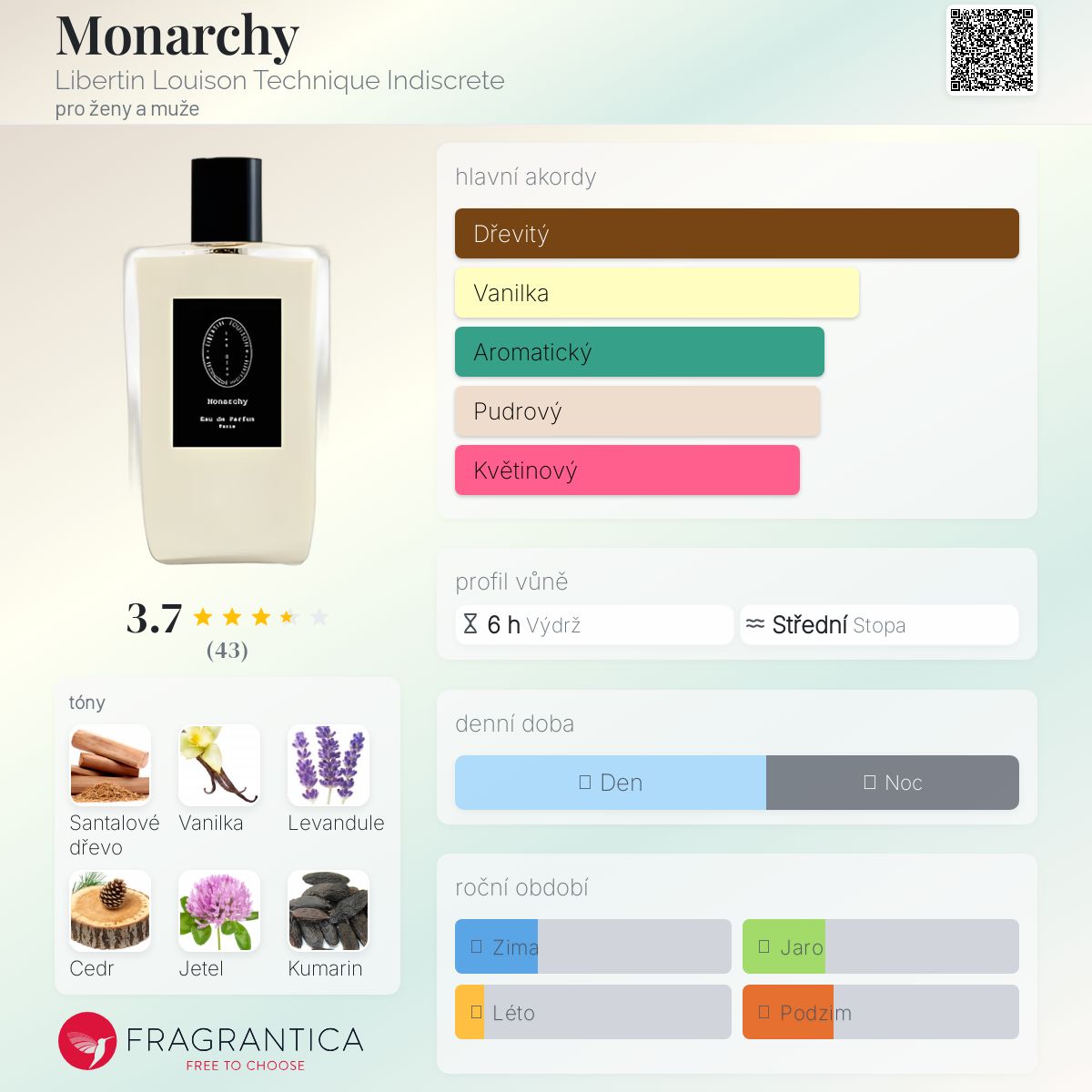 Monarchy podle Libertin Louison Technique Indiscrete je Orientální Woody vůně pro ženy a muže. Monarchy byl/a uveden/a v roce 2011. "Nosem" za touto vůní je Libertin Louison. Vrchní tóny jsou Bergamot a Citronová tráva; střední tóny jsouLevandule, Jetel, Kašmírové dřevo, Růže, Pelargónie a Konvalinka ; základní tóny jsou Santalové dřevo, Vanilka, Virginský cedr, Kumarin, Jantar (ambra), Dřevité tóny, Ambrette (přírodní pižmo) a Pižmo.