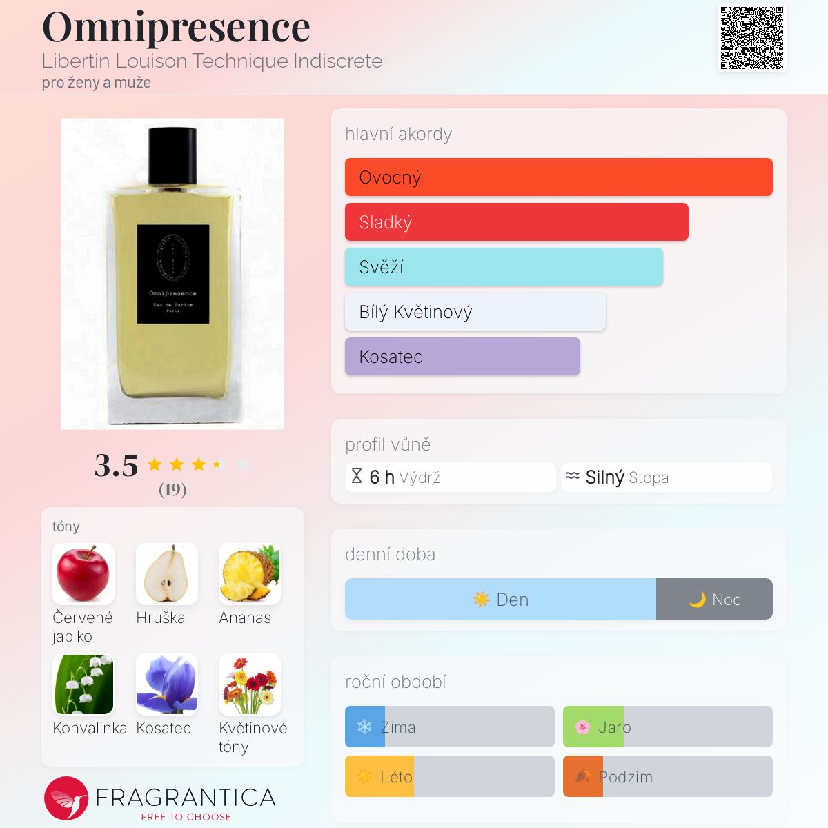 Omnipresence podle Libertin Louison Technique Indiscrete je Floral Woody Musk vůně pro ženy a muže. Vrchní tóny jsou Červené jablko, Hruška a Ananas; střední tóny jsouKonvalinka, Kosatec a Květinové tóny ; základní tóny jsou Pižmo, Kašmírové dřevo, Cedr a Vanilka.