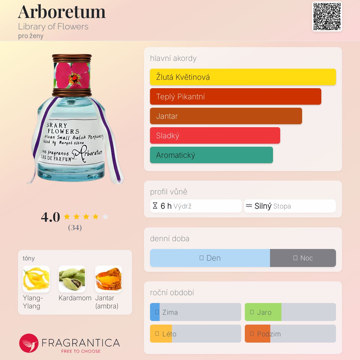 Arboretum podle Library of Flowers je Orientální Floral vůně pro ženy. Arboretum byl/a uveden/a v roce 2013. Vrchní tón je Kardamom ; střední tón jeYlang-Ylang ; základní tón je Jantar (ambra).