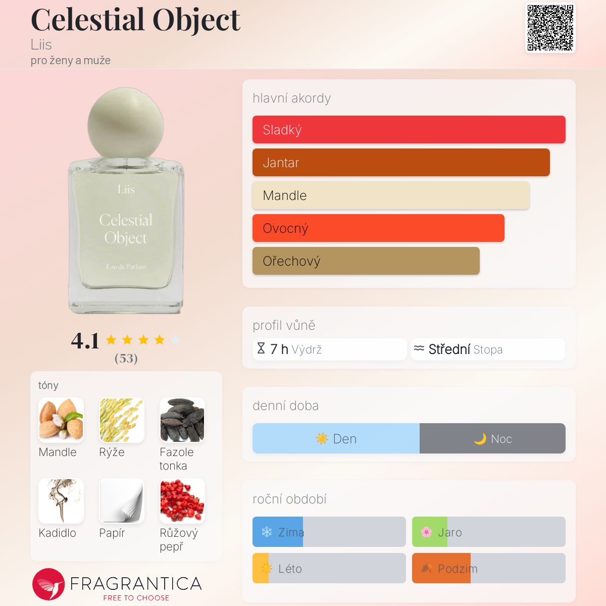 Celestial Object podle Liis je Woody Aromatic vůně pro ženy a muže. Toto je nová vůně. Celestial Object byl/a uveden/a v roce 2025. Vrchní tóny jsou Růžový pepř a Kdoule; střední tóny jsouMandle, Rýže, Kadidlo a Papír ; základní tóny jsou Fazole tonka a Labdanum.