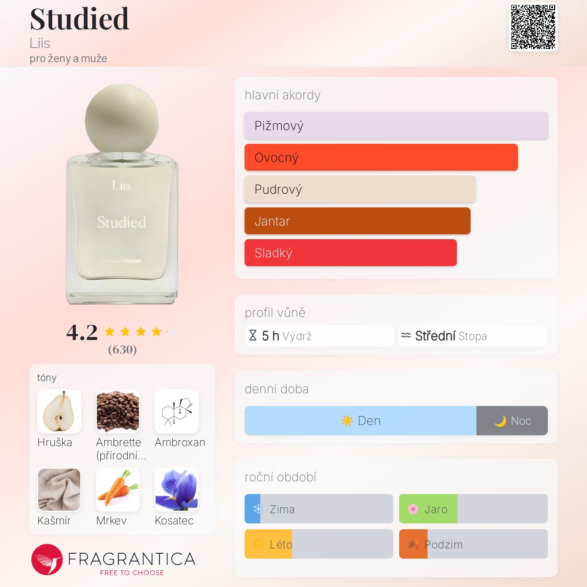 Studied podle Liis je Floral Fruity vůně pro ženy a muže. Studied byl/a uveden/a v roce 2020. Studied byl/a vytvořen/a Alissa Sullivan a Leslie Hendin. Vrchní tóny jsou Hruška a Ambrette (přírodní pižmo); střední tóny jsouMrkev a Kosatec ; základní tóny jsou Ambroxan a Kašmír.