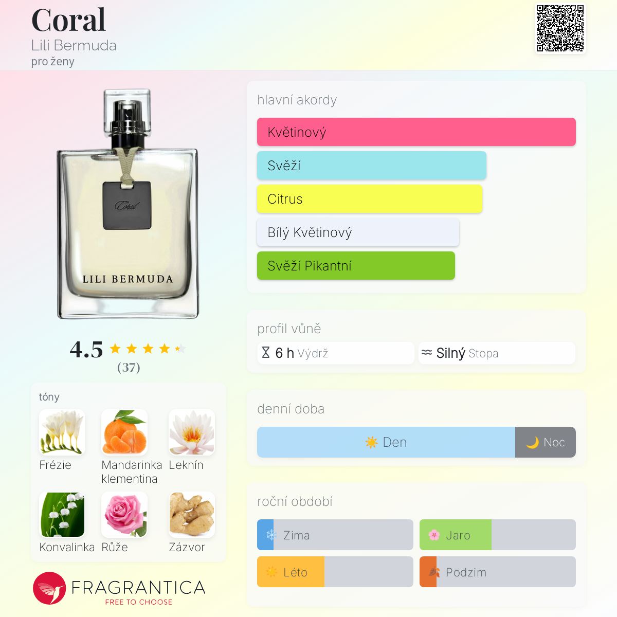 Coral podle Lili Bermuda je Floral Green vůně pro ženy. Coral byl/a uveden/a v roce 2006. "Nosem" za touto vůní je Isabelle Ramsay-Brackstone. Vrchní tóny jsou Frézie, Mandarinka klementina, Zázvor a Pepř; střední tóny jsouLeknín, Konvalinka a Růže ; základní tóny jsou Pižmo a Vetiver.
