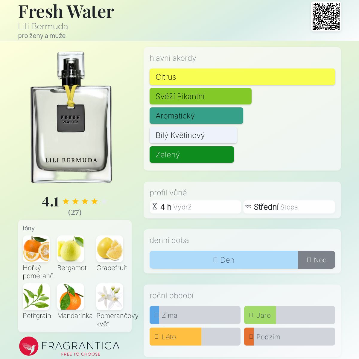 Fresh Water podle Lili Bermuda je Citrus vůně pro ženy a muže. Fresh Water byl/a uveden/a v roce 2009. "Nosem" za touto vůní je Vito Lenoci. Vrchní tóny jsou Hořký pomeranč, Bergamot, Grapefruit a Mandarinka; střední tóny jsouPetitgrain a Květ afrického pomeranče ; základní tóny jsou Pižmo a Kadidlo.