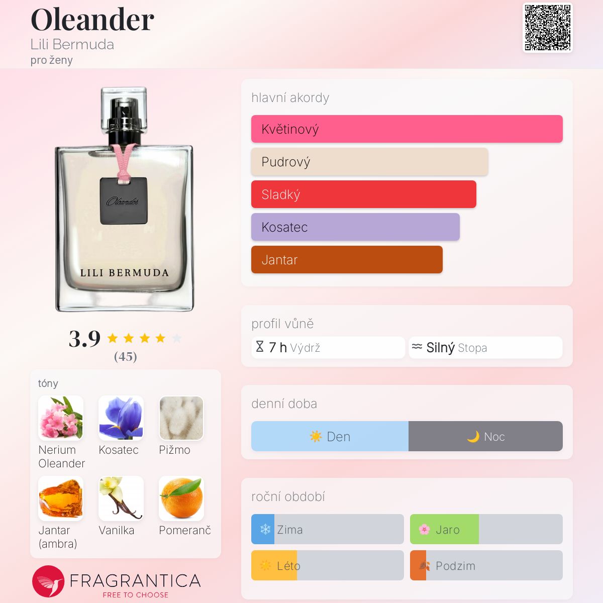 Oleander podle Lili Bermuda je Floral vůně pro ženy. Oleander byl/a uveden/a v roce 1936. "Nosem" za touto vůní je Madeline Scott. Vrchní tón je Pomeranč ; střední tóny jsouRůžový oleandr a Kosatec ; základní tóny jsou Pižmo, Jantar (ambra) a Vanilka.
