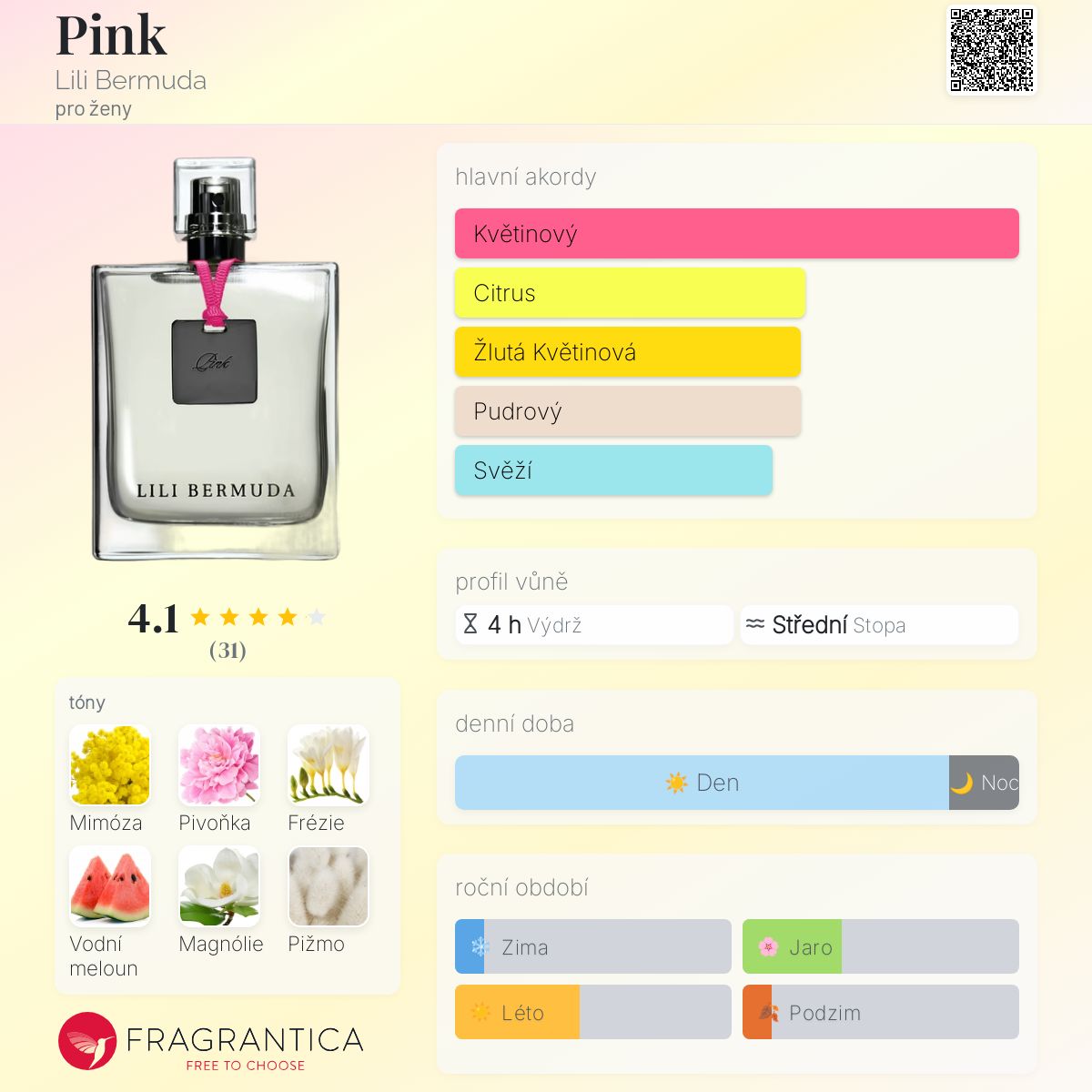 Pink podle Lili Bermuda je Floral vůně pro ženy. Pink byl/a uveden/a v roce 2007. "Nosem" za touto vůní je Isabelle Ramsay-Brackstone. Vrchní tóny jsou Grapefruit, Růžový pepř a Mandarinka klementina; střední tóny jsouMimóza, Pivoňka, Frézie, Vodní meloun a Magnólie ; základní tóny jsou Pižmo a Broskev.