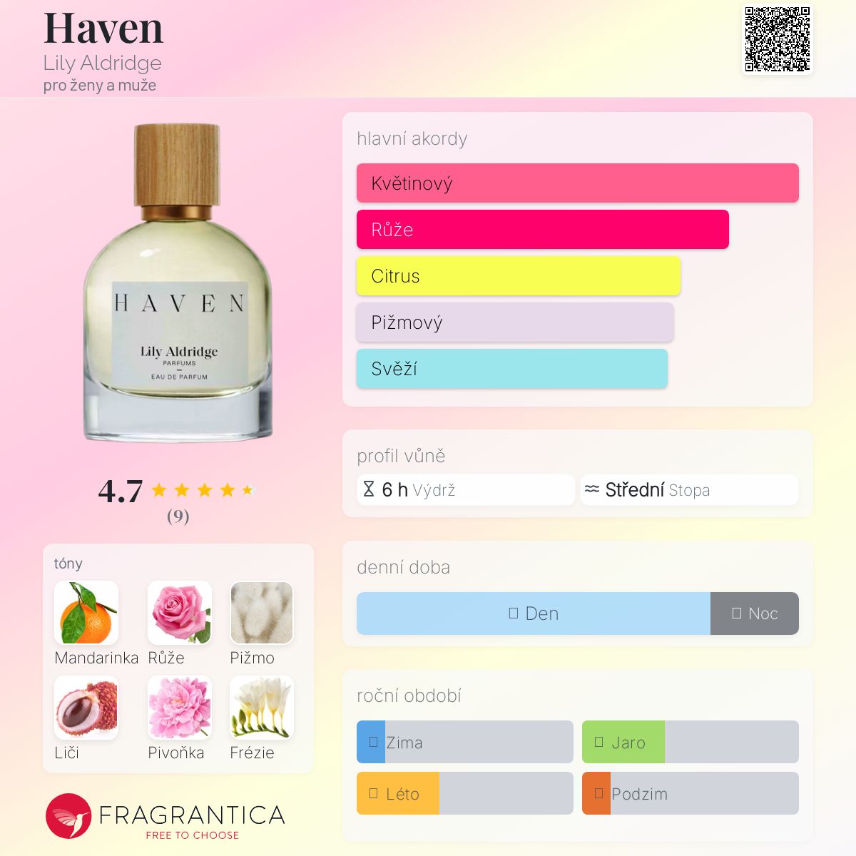 Haven podle Lily Aldridge je Floral Woody Musk vůně pro ženy a muže. Haven byl/a uveden/a v roce 2019. Vrchní tóny jsou Mandarinka a Liči; střední tóny jsouRůže, Pivoňka a Frézie ; základní tóny jsou Pižmo, Jantar (ambra) a Cedr.