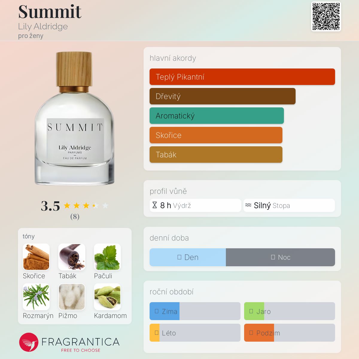 Summit podle Lily Aldridge je Woody Spicy vůně pro ženy. Summit byl/a uveden/a v roce 2019. Vrchní tóny jsou Skořice a Růžový pepř; střední tóny jsouTabák, Rozmarýn a Kardamom ; základní tóny jsou Pačuli, Pižmo, Kůže a Santalové dřevo.