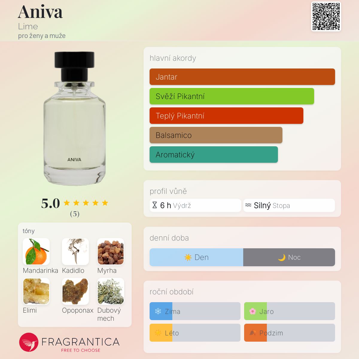 Aniva podle Lime je Aromatic vůně pro ženy a muže. Toto je nová vůně. Aniva byl/a uveden/a v roce 2025. Vrchní tóny jsou Mandarinka, Kadidlo, Myrha a Elemi; střední tóny jsouOpoponax, Dubový mech, Vetiver, Jantar (ambra) a Semiš ; základní tóny jsou Černý pepř, Slaměnka, Šafrán, Muškátový oříšek a Římský kmín.