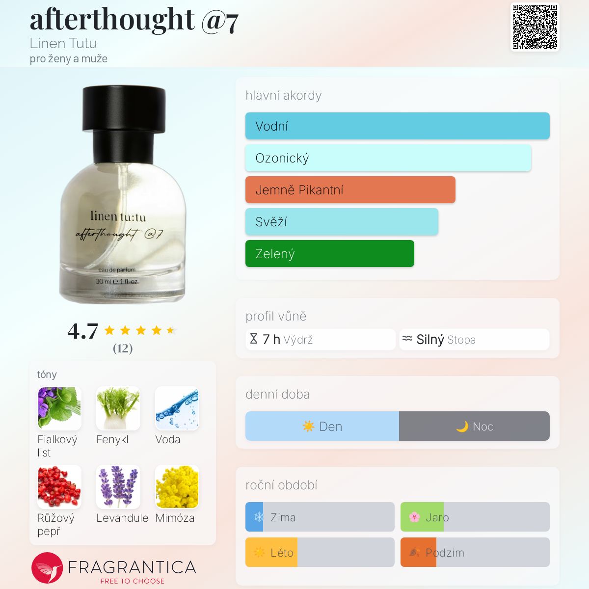 afterthought @7 podle Linen Tutu je Aromatic Aquatic vůně pro ženy a muže. Toto je nová vůně. afterthought @7 byl/a uveden/a v roce 2024. "Nosem" za touto vůní je Daniela Carrasco. Vrchní tóny jsou Fenykl, Vodnaté tóny a Růžový pepř; střední tóny jsouFialkový list, Levandule a Mimóza ; základní tóny jsou Naplavené dříví, Santalové dřevo a Vodní meloun.