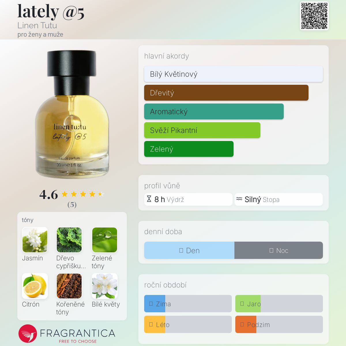 lately @5 podle Linen Tutu je Floral vůně pro ženy a muže. Toto je nová vůně. lately @5 byl/a uveden/a v roce 2024. "Nosem" za touto vůní je Daniela Carrasco. Vrchní tóny jsou Zelený tón, Citrón, Kořeněné tóny a Šafrán; střední tóny jsouJasmín Sambac a Bílé květy ; základní tóny jsou Cypřišek tupolistý, Vanilka a Kouř.