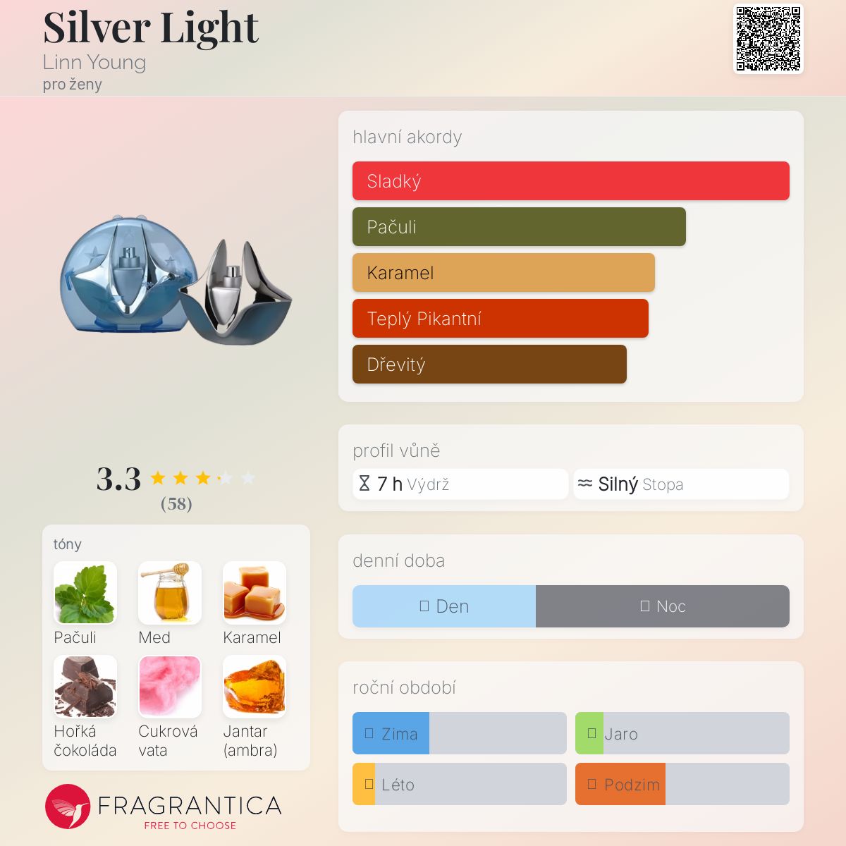 Silver Light podle Linn Young je Orientální Vanilla vůně pro ženy. Vrchní tóny jsou Cukrová vata, Jasmín, Kokos, Bergamot, Černý rybíz, Meloun a Mandarinka; střední tóny jsouMed, Meruňka, Jasmín, Švestka, Broskev, Orchidej, Konvalinka, Červené bobule, Růže a Ostružina ; základní tóny jsou Pačuli, Karamel, Hořká čokoláda, Jantar (ambra), Vanilka, Fazole tonka a Pižmo.