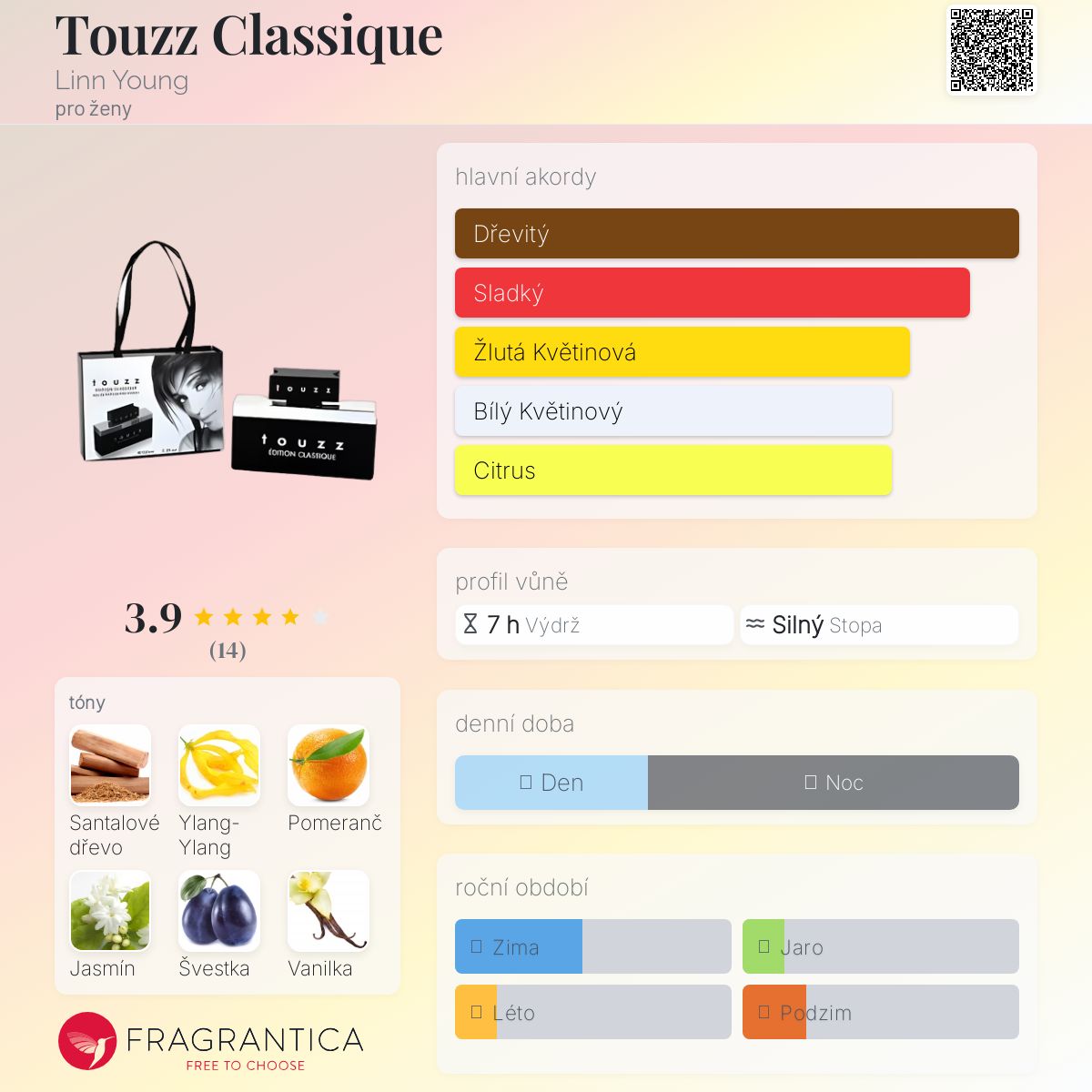 Touzz Classique podle Linn Young je Floral Fruity vůně pro ženy. Vrchní tóny jsou Pomeranč a Švestka; střední tóny jsouYlang-Ylang a Jasmín ; základní tóny jsou Santalové dřevo a Vanilka.