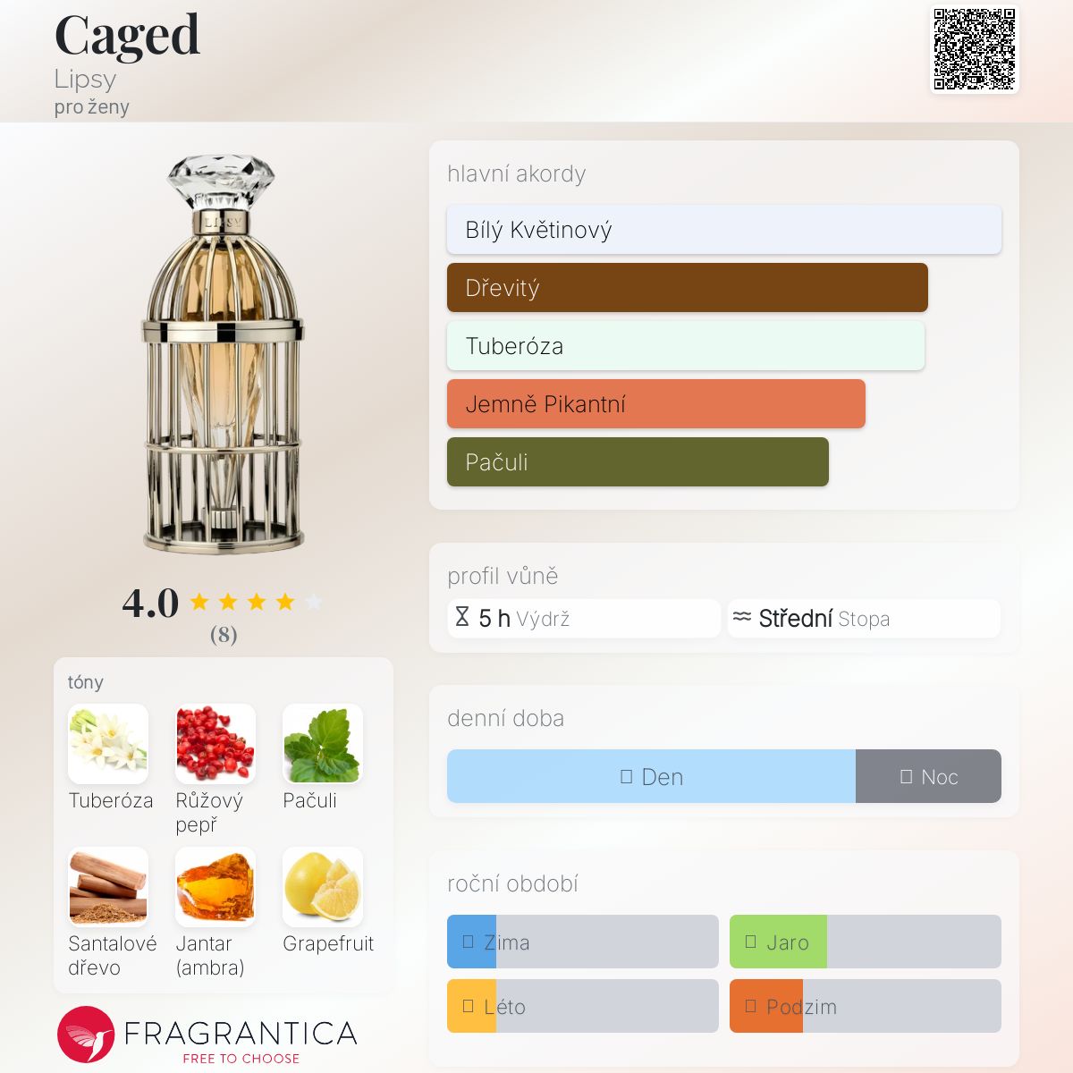 Caged podle Lipsy je Orientální Floral vůně pro ženy. Caged byl/a uveden/a v roce 2014. Vrchní tóny jsou Tuberóza, Růžový pepř, Grapefruit, Gardénie a Frézie; střední tóny jsouPačuli, Santalové dřevo, Vanilka a Lilie ; základní tóny jsou Jantar (ambra), Pižmo a Kadidlo.