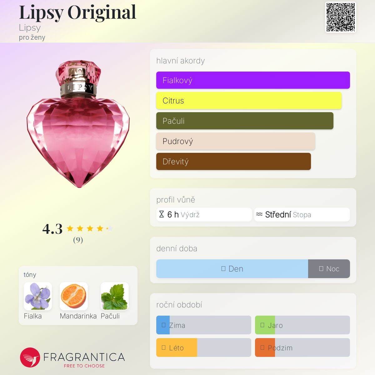 Lipsy Original podle Lipsy je Floral Fruity vůně pro ženy. Lipsy Original byl/a uveden/a v roce 2018. Vrchní tón je Mandarinka ; střední tón jeFialka ; základní tón je Pačuli.