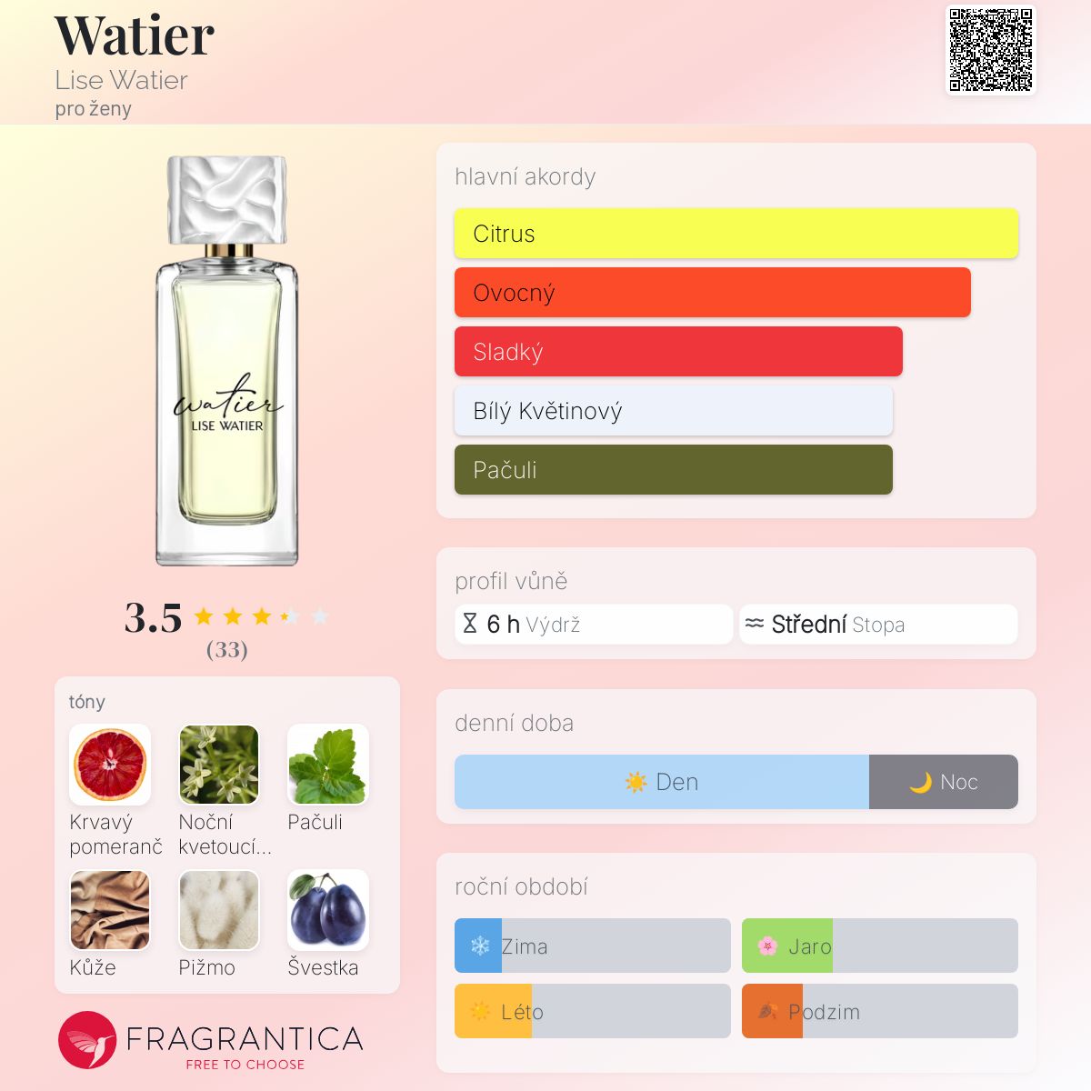 Watier podle Lise Watier je Floral vůně pro ženy. Watier byl/a uveden/a v roce 2019. "Nosem" za touto vůní je Michelle DeFina. Vrchní tóny jsou Krvavý pomeranč, Švestka mirabelka, Sicilský bergamot a Růžový pepř; střední tóny jsouNoční kvetoucí jasmín, Kůže a Turecká růže ; základní tóny jsou Pačuli, Pižmo, Bourbonská vanilka, Santalové dřevo a Jantar (ambra).