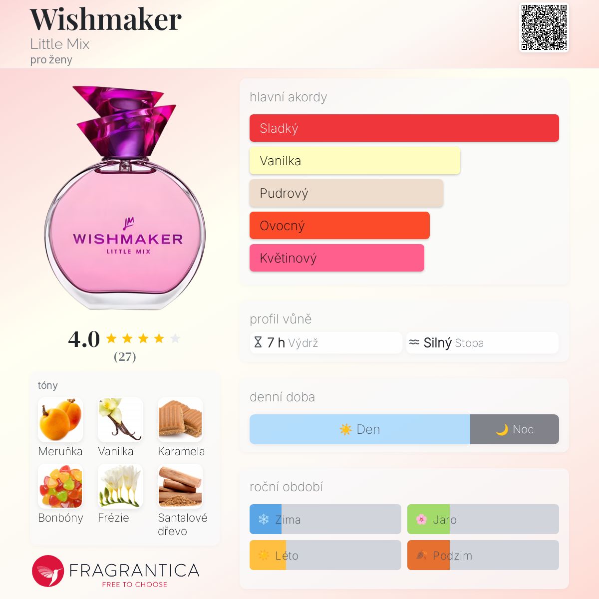 Wishmaker podle Little Mix je Floral Fruity Gourmand vůně pro ženy. Wishmaker byl/a uveden/a v roce 2016. Vrchní tón je Meruňka ; střední tóny jsouFrézie a Neroli ; základní tóny jsou Vanilka, Karamela, Sladké tóny a Santalové dřevo.