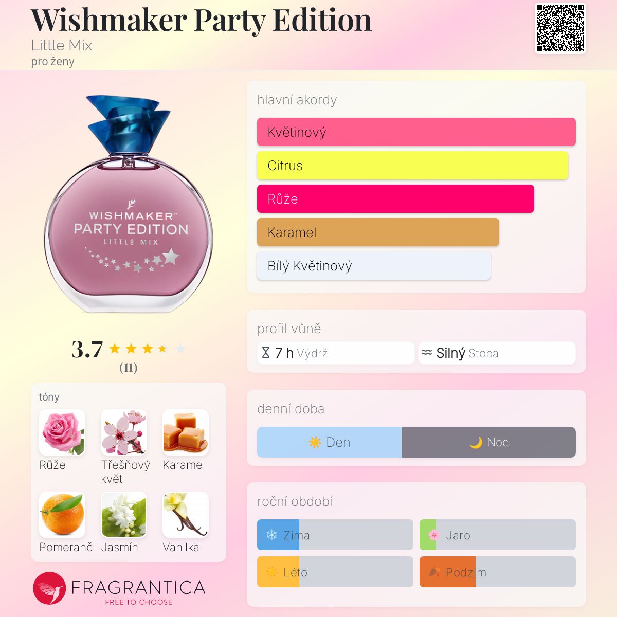 Wishmaker Party Edition podle Little Mix je Floral Fruity Gourmand vůně pro ženy. Wishmaker Party Edition byl/a uveden/a v roce 2017. "Nosem" za touto vůní je Celia Orozco Cirimbilli. Vrchní tóny jsou Pomeranč a Bergamot; střední tóny jsouRůže, Třešňový květ a Jasmín ; základní tóny jsou Karamel a Vanilka.