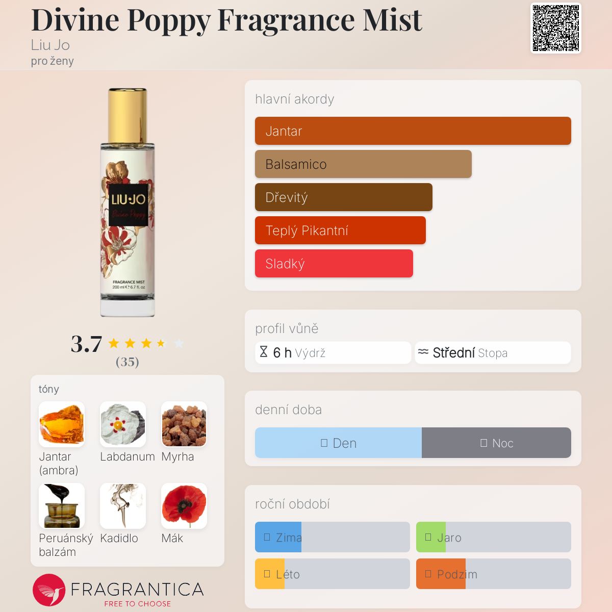 Divine Poppy Fragrance Mist podle Liu Jo je Orientální Floral vůně pro ženy. Divine Poppy Fragrance Mist byl/a uveden/a v roce 2021. Vrchní tóny jsou Mandarinka, Kalábrijský bergamot a Citrón; střední tóny jsouKadidlo, Mák a Pačuli ; základní tóny jsou Jantar (ambra), Labdanum, Myrha a Peruánský balzám.