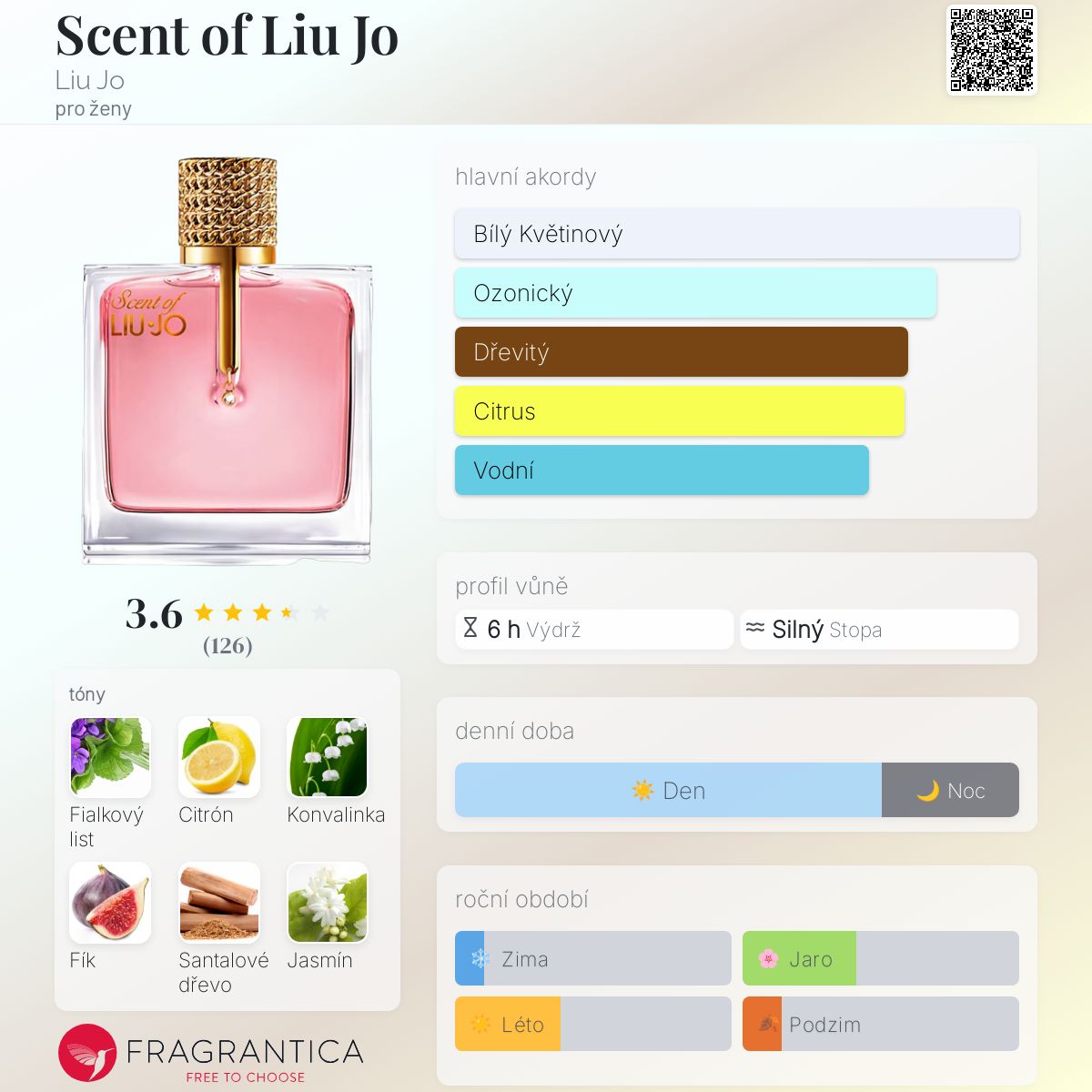 Scent of Liu Jo podle Liu Jo je Floral Fruity vůně pro ženy. Scent of Liu Jo byl/a uveden/a v roce 2015. Vrchní tóny jsou Fialkový list, Citrón a Kardamom; střední tóny jsouKonvalinka, Fík a Jasmín ; základní tóny jsou Santalové dřevo, Pižmo a Jantar (ambra).