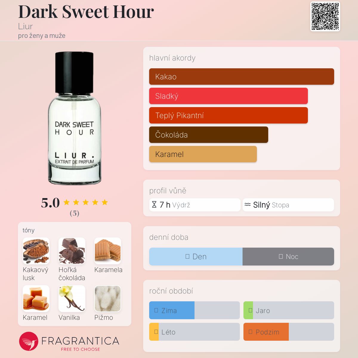 Dark Sweet Hour podle Liur je Orientální Vanilla vůně pro ženy a muže. Dark Sweet Hour byl/a uveden/a v roce 2023. Vrchní tón je Kakao ; střední tóny jsouČokoláda a Karamel ; základní tóny jsou Karamela, Vanilka a Pižmo.