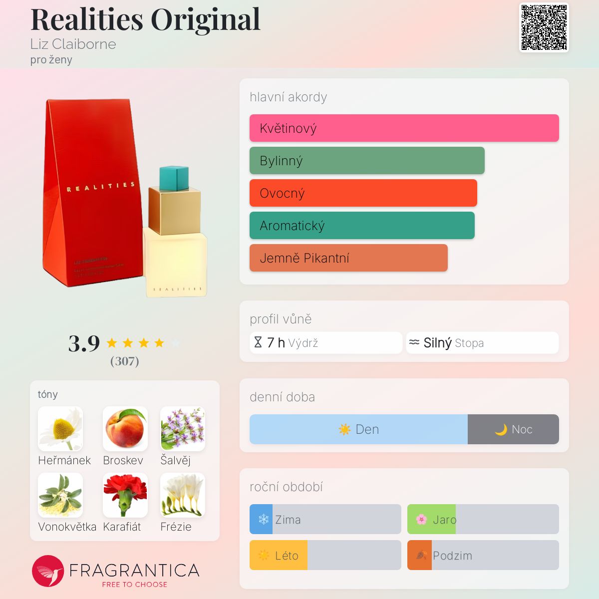 Realities Original podle Liz Claiborne je Floral Green vůně pro ženy. Realities Original byl/a uveden/a v roce 1990. Vrchní tóny jsou Heřmánek, Šalvěj, Vonokvětka a Bergamot; střední tóny jsouKarafiát, Frézie, Lilie, Bulharská růže a Jasmín ; základní tóny jsou Broskev, Santalové dřevo, Jantar (ambra) a Vanilka.