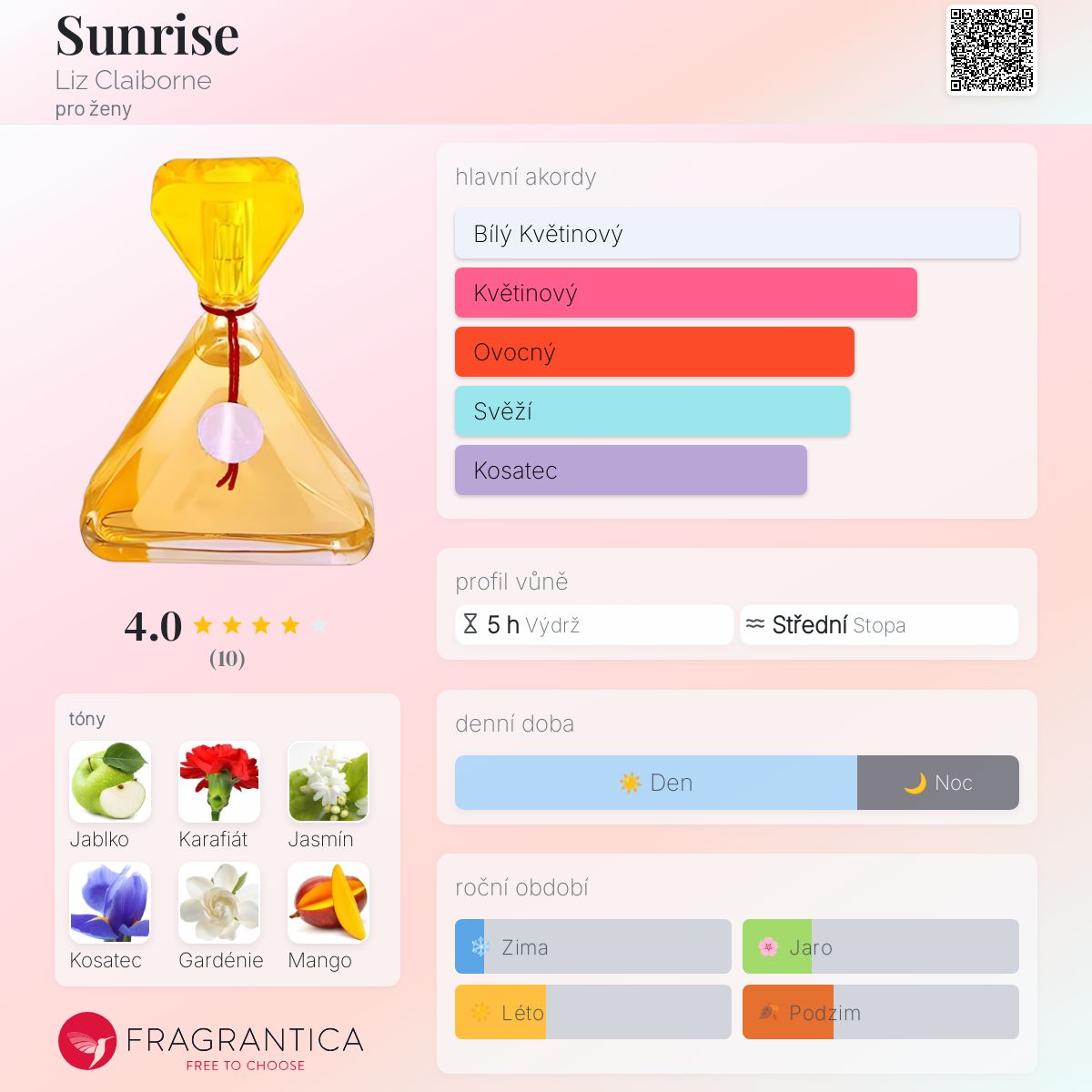 Sunrise podle Liz Claiborne je vůně pro ženy. Vrchní tóny jsou Jablko, Mango a Citrusy; střední tóny jsouKarafiát, Jasmín, Kosatec, Gardénie, Magnólie, Konvalinka a Skořice ; základní tóny jsou Pižmo, Vetiver a Jantar (ambra).