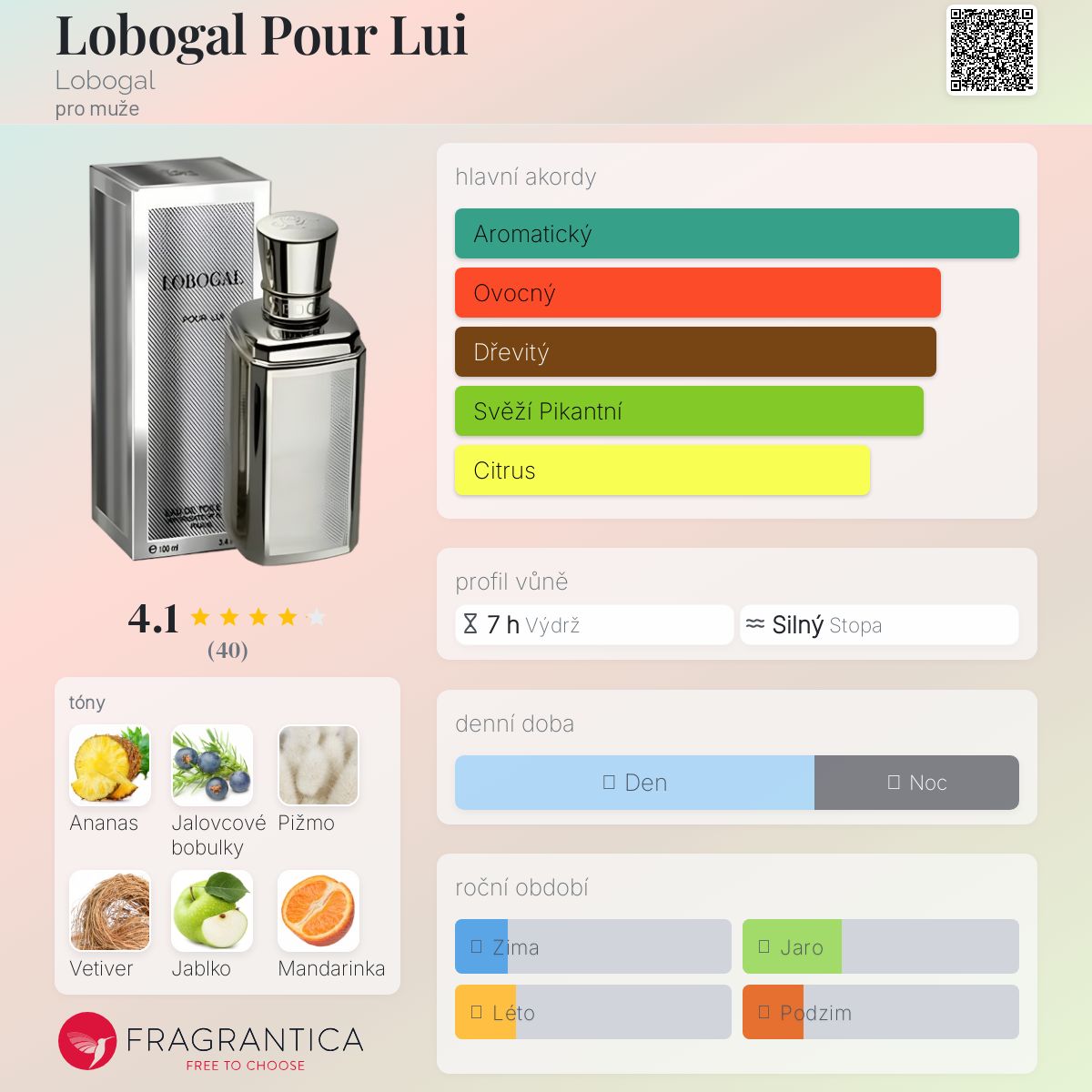 Lobogal Pour Lui podle Lobogal je Aromatic Fruity vůně pro muže. Lobogal Pour Lui byl/a uveden/a v roce 2004. Lobogal Pour Lui byl/a vytvořen/a Pierre Bourdon a Valerie Garnuch-Mentzel. Vrchní tóny jsou Ananas, Jalovcové bobulky, Jablko, Mandarinka, Bergamot, Jamajský pepř, Muškátový oříšek, Bílý pepř a Zázvor; střední tóny jsouLevandule, Jasmín, Fialka a Konvalinka ; základní tóny jsou Pižmo, Vetiver, Ebenové dřevo a Mahagon.